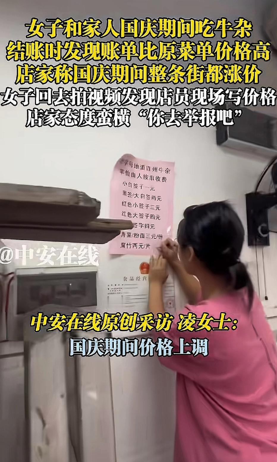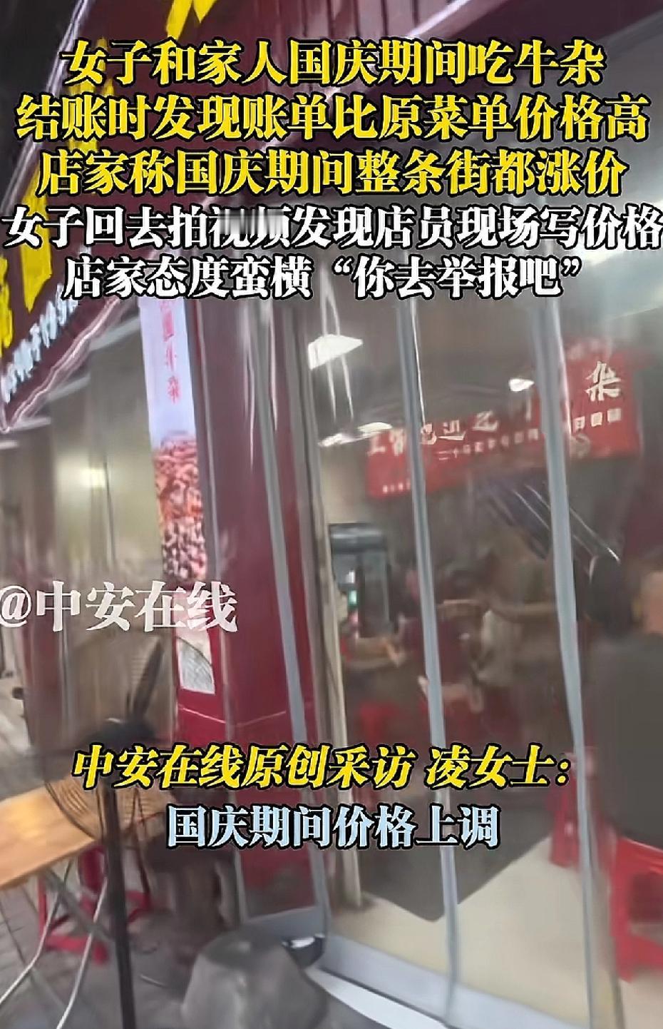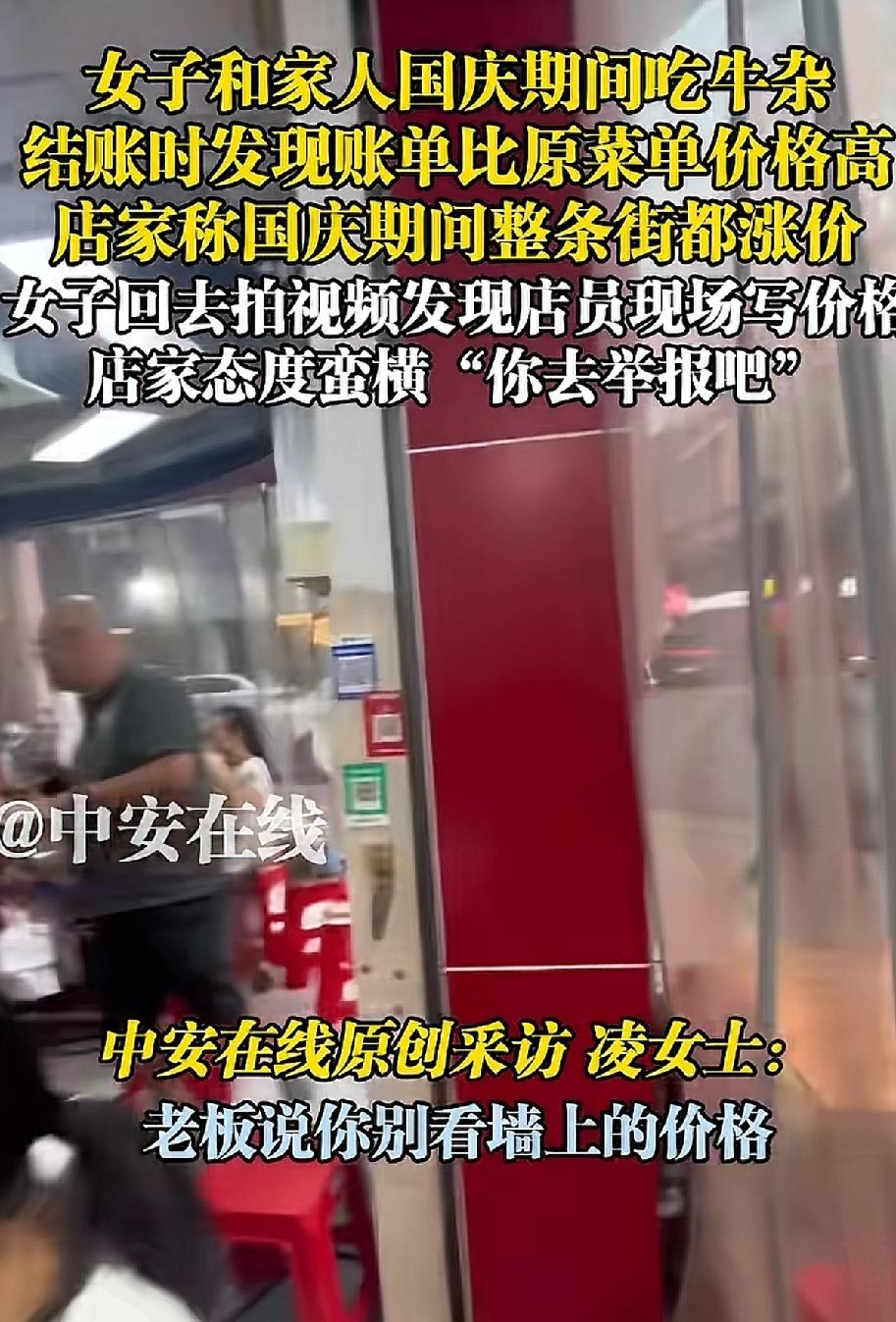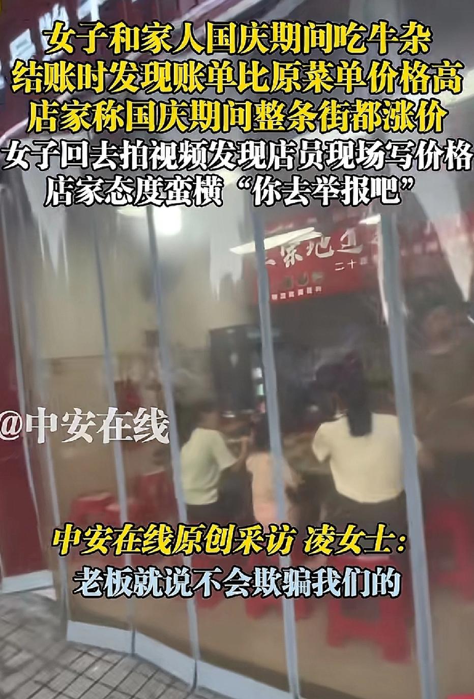 这家店火了。一位女子带着家人前往广东一家名为“清远串串香花园牛杂”的小吃店就餐,结账时,女子对价格提出质疑。老板不耐烦地回应:“国庆期间,整条街的饭店都涨价了,不会骗你的。” 女子反驳道:“你墙上的价格表没涨价啊。” 老板和店里的几个员工随即围到女子与家人的餐桌旁,一名身着粉色衣服的女服务员叫嚣道:“你不服气就去报12345啊,你报警啊。” 女子见这么多人围着,担心发生意外,只好付款204元。 女服务员转身拿起笔,在价格表上写下“国庆期间涨价”。 这是在提示食客吗? 女子已拨打当地的12345。 通常只有春节期间饭店会涨价,也是因为员工回乡过年,只能给员工加工资,才会涨价。 国庆期间饭店涨价的情况极为少见。 饭店老板如此做法,难道是在欺负游客吗? 来源:中安在线
