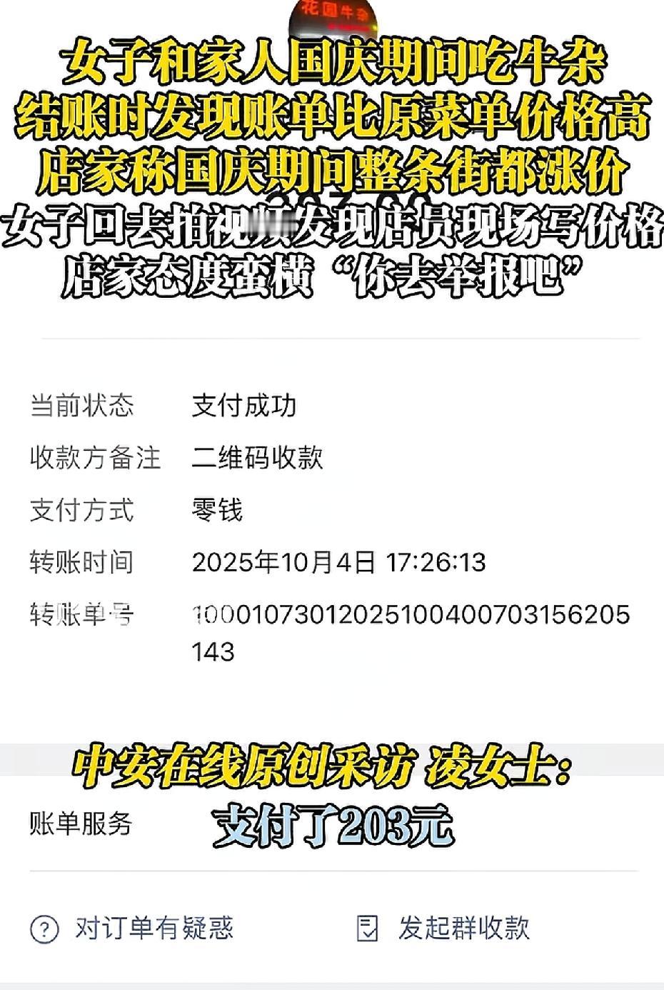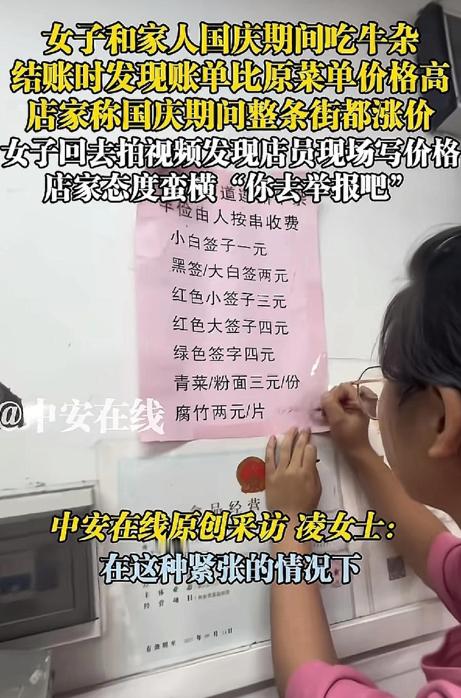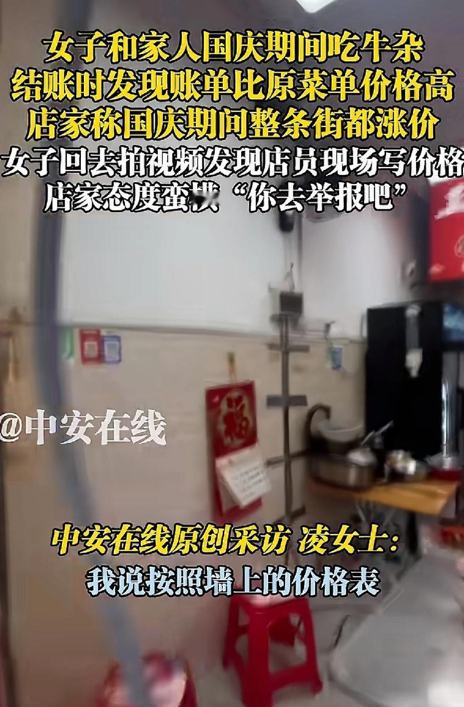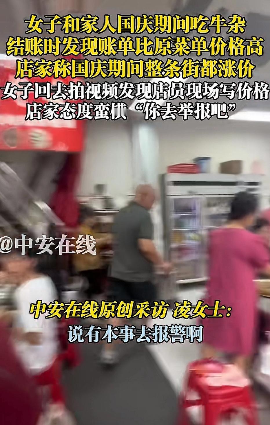 这家店火了。一位女子带着家人前往广东一家名为“清远串串香花园牛杂”的小吃店就餐,结账时,女子对价格提出质疑。老板不耐烦地回应:“国庆期间,整条街的饭店都涨价了,不会骗你的。” 女子反驳道:“你墙上的价格表没涨价啊。” 老板和店里的几个员工随即围到女子与家人的餐桌旁,一名身着粉色衣服的女服务员叫嚣道:“你不服气就去报12345啊,你报警啊。” 女子见这么多人围着,担心发生意外,只好付款204元。 女服务员转身拿起笔,在价格表上写下“国庆期间涨价”。 这是在提示食客吗? 女子已拨打当地的12345。 通常只有春节期间饭店会涨价,也是因为员工回乡过年,只能给员工加工资,才会涨价。 国庆期间饭店涨价的情况极为少见。 饭店老板如此做法,难道是在欺负游客吗? 来源:中安在线