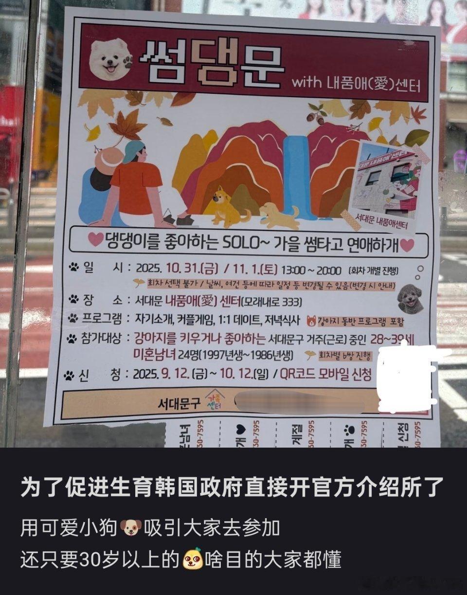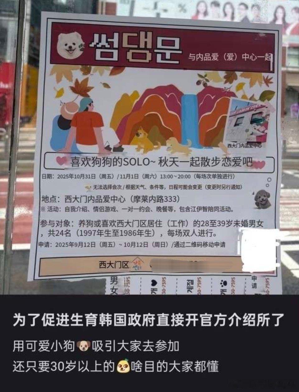 为了提高生育率,韩国直接开官方介绍所了。养狗的或者喜欢狗的28岁~39岁未婚单身男女可以参加。[doge][doge]热点现场海外新鲜事