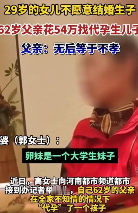 湖南,一62岁大爷想抱外孙,可29岁女儿却迟迟不肯结婚,大爷一怒之下,瞒着家人花54万代孕一个儿子!卵子由24岁女大学生提供,35岁的代孕女子已怀孕5个月!令女儿崩溃的是,大爷竟表示:“我死了你来照顾弟弟!” 高大爷今年62岁,个头高大,身板硬朗,可近几个月来,他的心里总是七上八下——一想到自己晚年的盼望:抱上一个孙子,他就坐不住了。 家里的老伴郭大妈年过六旬,却比他更稳重一些,总是劝他别急:“孩子的事,急不来。高某她也有她的想法,再等两年吧,让她自己想通。” 然而,高大爷怎么能等得了?独生女高某今年29岁,父母眼中唯一的希望,眼看都快奔三十了,却仍是单身。 她的性格独立、倔强,总是对结婚提不起兴趣,周围亲戚朋友不断“关心”,更让她有些排斥。 高大爷一方面希望女儿幸福,一方面又渴望抱孙子,这种矛盾的心情在心底像火焰一样燃烧,越压越不住。 终于,在一次家庭聚会上,高大爷按捺不住,把自己的想法直接说了出来:“我实在等不下去了,我就想抱个孙子,不行吗?哪怕是……代孕也行。” 郭大妈听了,先是愣了愣,随即摇头:“傻老头,你这可行不通啊!别做傻事,花那么多钱去找代孕,不是闹着玩的吗?” 高大爷心一横,他做出了一个惊人的决定:瞒着郭大妈和高某,花了54万,通过中介找来一位年轻的大学生提供卵子,又找了一位35岁的女性代孕母亲。 五个月过去了,孩子已经在代孕母体里孕育。 这个消息,如果被高某知道,她一定会崩溃。高大爷第一次偷偷带她去体检中心的时候,医生提起的一句:“高女士,您父亲的代孕合同已经登记……” 高某一愣,整个人如遭雷击。她想不通,父亲为什么会背着自己做这种事?她和父亲平时的关系再好,也没有想到他会这样单方面决定家庭的重大事务。 更令她心里发凉的是,高大爷在解释时说的话:“我死了,你就得照顾弟弟。” 这句话如同晴天霹雳,击打在她的心上。高某想了半天才明白,这个孩子,不仅是父亲实现心愿的“替代”,在父亲心里,还带着某种“债务”的意味——她必须承担起照顾孩子的责任。 忍无可忍,高某决定采取行动。她拿起电话,向相关部门举报了父亲的代孕行为。 消息一出,整个家庭陷入风暴。卫健委介入调查,高大爷的计划彻底泡汤。 原本签署的代孕合同被宣布无效,54万的代金追回大半,代孕母亲则将孩子交还给卵子捐献者那边处理。至于孩子的抚养权,双方开始扯皮,情况复杂而混乱。 亲戚们一边叹气,一边议论纷纷:“高大爷这是糊涂啊!为了孙子把自己都搞得这么麻烦。”还有人指责高某:“你父亲老了,心里想着一个孙子也可以理解。” 但高某心里明白,她无法接受父亲用自己的方式,把家庭和伦理推向边缘。同时,社会舆论也开始关注此事。新闻报道中,高大爷的行为被称为“另类代孕”,引发热议。 有人指责这是父权心理作祟,也有人同情老人渴望抱孙子的心情。高某在朋友圈里低调发声:“这是家事,不是儿戏。” 随着事件的持续发酵,高大爷终于明白,他的方式不仅伤害了女儿,也给家庭带来了不必要的混乱。他沉默地坐在沙发上,看着电视里关于代孕的报道,心里空落落的。