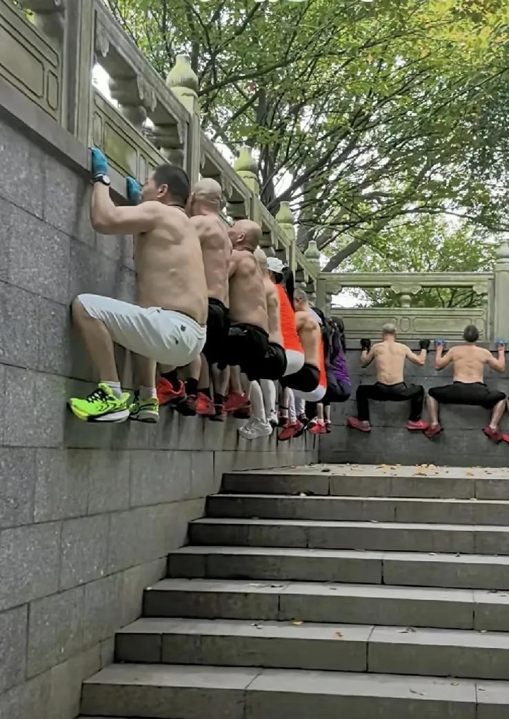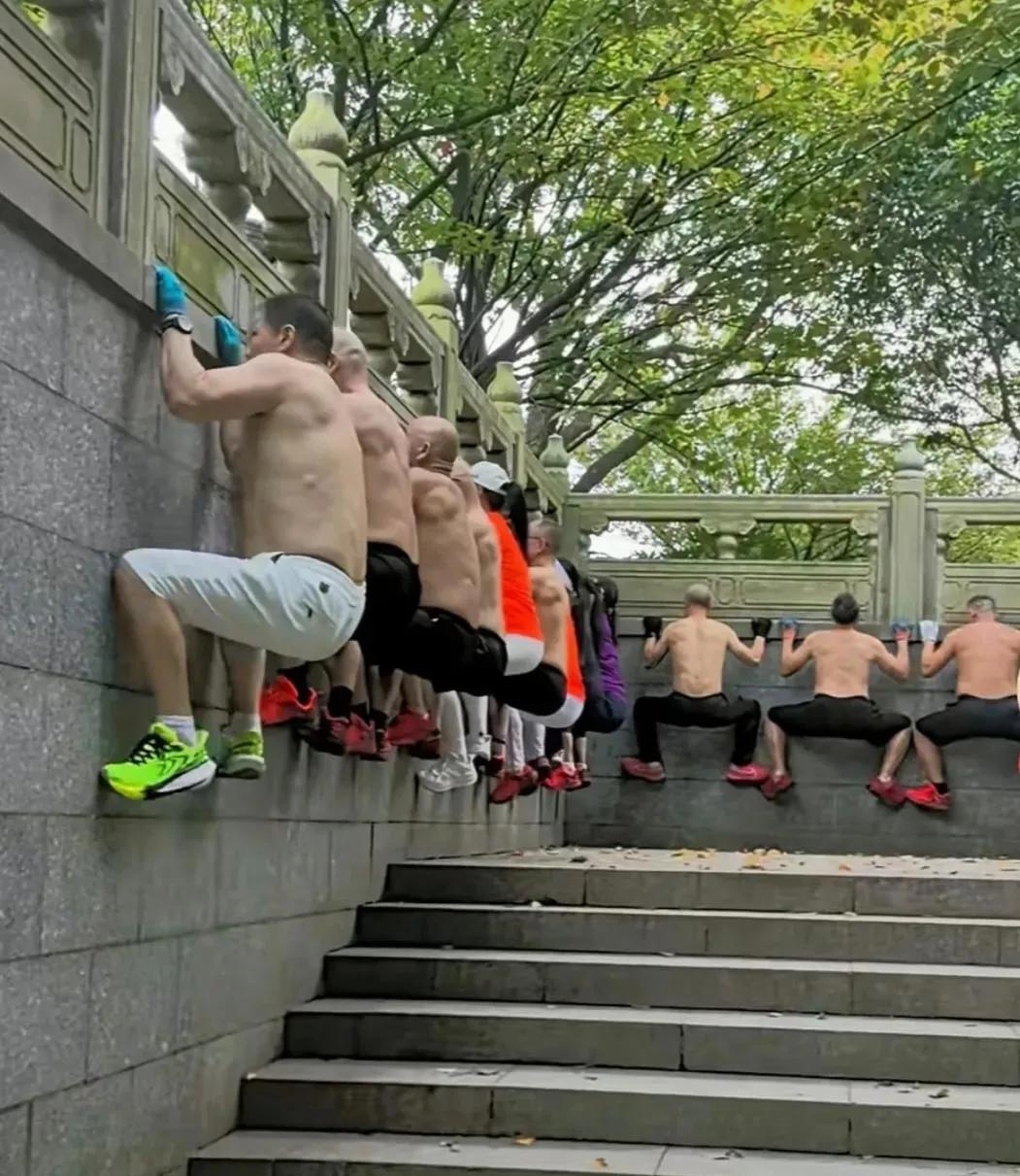 大爷大妈们这是练的什么功? 今天逛公园,看到一幕,真的惊讶到我了,只见一群老人,集体悬挂在栏杆上,我一时好奇,就问了其中一个大叔,他很热情,给我介绍说,这是一种壁虎功,老祖宗传下来的,可以锻炼手臂、腹部肌肉和腰力。 大家觉得怎么样?