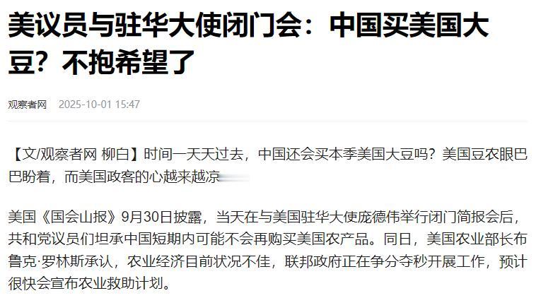 9月底,美国国会议员听完驻华大使珀杜汇报,基本认定中国短期内不会恢复购买美农产品,说到底,问题卡在美国先加的那道高关税上。 今年4月,特朗普一拍桌子说“中国贸易逆差太大”,反手就对中国商品加了一堆税。我们这边也没含糊,直接对美国农产品下了手,额外加征了25%的关税。 这一下,美国农民直接懵圈了——2017年的时候,中国还买走全美37%的大豆,到了2025年,新季大豆订单直接归零,仓库里的豆子堆得比人还高,就是卖不出去。 美国政府倒是喊着给“政府给补贴”,可这补贴跟闹着玩似的。2019年的时候就发了230亿美元补贴,结果84亿都进了前10%的大农场主口袋,小农户平均下来才拿5000美元。 今年又说要发100亿到140亿,可农民们一算账就笑不出来了:种一亩大豆成本得700美元,现在市场价跌得厉害,每英亩要亏近100美元,这点补贴连填窟窿的零头都不够。 更让美国农民窝火的是,自己的市场还被别人给抢了,这边美国豆子卖不动南美国家可没闲着。 阿根廷9月宣布大豆出口零关税,两天就跟中国签了70亿美元的订单,40批大豆11月就能运到中国港口。巴西更狠,靠着一年两熟的气候和便宜劳动力,2025年对华大豆出口占比直接超了70%,把美国从“第一供应商”的位置上直接拽了下来。 我们这边也在做准备,一边扩大从俄罗斯、乌克兰的农产品进口,一边研究出低蛋白饲料配方,减少对大豆的依赖。明尼苏达州大豆协会主席约翰逊直言:“我们要的不是政府发钱,是实实在在的市场啊!供应链这东西一旦转走了,再想抢回来比登天还难。” 这麻烦还不止在农业上,直接反噬到了特朗普的政治基本盘。艾奥瓦州、印第安纳州这些大豆主产区,以前都是共和党的“票仓”,现在农民们怨气冲天。 密苏里州共和党众议员马克·阿尔福德坦言:“我的选民今年大豆收成不错,可因为价格太低,说不定要破产。”就这种情况下,马上临近的中期大选又有多少人会投给特朗普团队呢? 更打脸的是,美国政府自己还在“拆台”。五角大楼为了安抚汽车业,4月宣布减免本土车企关税,却对农业危机装聋作哑。 珀杜在简报里没敢明说的是,要解决这事其实很简单,美国把加的关税取消了就行了。我商务部早就把话说明白了,恢复农产品贸易的前提,就是美方放下关税大棒。 可特朗普至今还嘴硬,在社交媒体上甩锅给拜登,说“都是民主党没执行好协议”。这种“死不认错”的态度,只会让农民彻底寒心。 现在的美国农业,就像一台卡了壳的拖拉机,关税是卡住齿轮的石头,补贴是没用的润滑剂,市场被抢是轮胎瘪了,越折腾越动不了。 特朗普要是再抱着“美国优先”的霸权思维不放,等到2026年中期大选,铁锈带的选民恐怕要用选票告诉他:靠欺负人搞贸易,最终坑的还是自己。