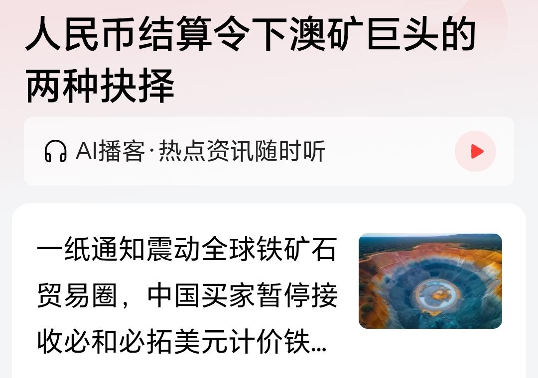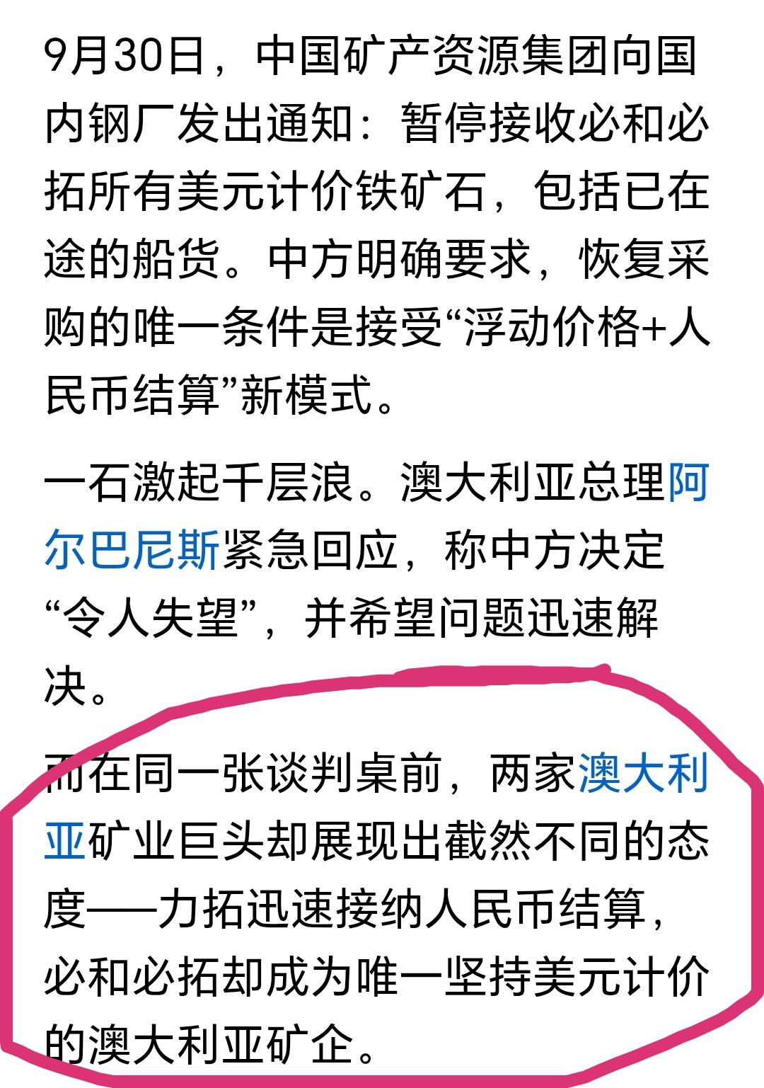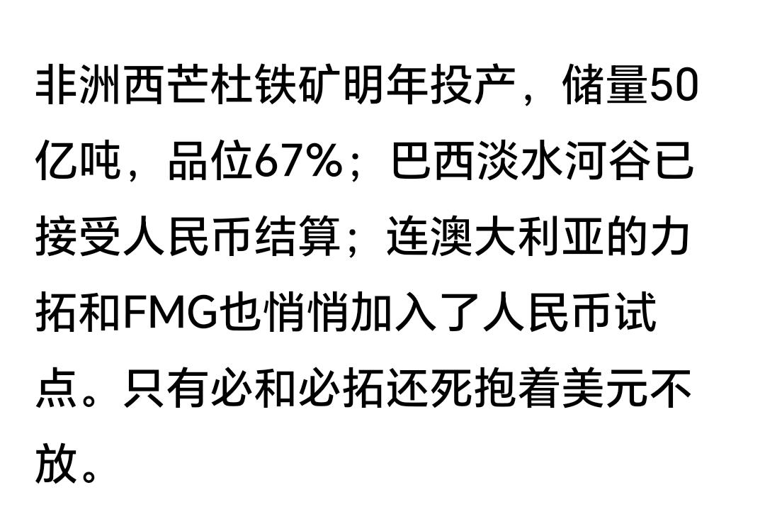 中美打架,袋鼠受伤。这不是在铁矿石上讨价还价的问题,这是人民币向美元霸权开出的第一炮。 淡水河谷和力拓都接受的人民币结算,现在只剩必和必拓了。在铁矿石战场中国已经屯够资源,终于有了议价权。 石油以美元定价,其他大宗将以人民币定价。所以现在SWIFT中国的占比在降低, CIPS中国却在高歌猛进。 人民币用游击战地道战地雷战麻雀战……一点一点地蚕食美元的霸权。 当美军连钢铁也被压制,当美元也走向崩溃的边缘,美国就凭一枚新硬币就能MAGA吗? 我们这代人真有幸,看到世界两大帝国的崩塌。见证历史的发展,更能理解为何中华文明能屹立不倒5000年,这才是真正的天选之子。 点右上角关注我,我们一起去看这个魔幻的世界