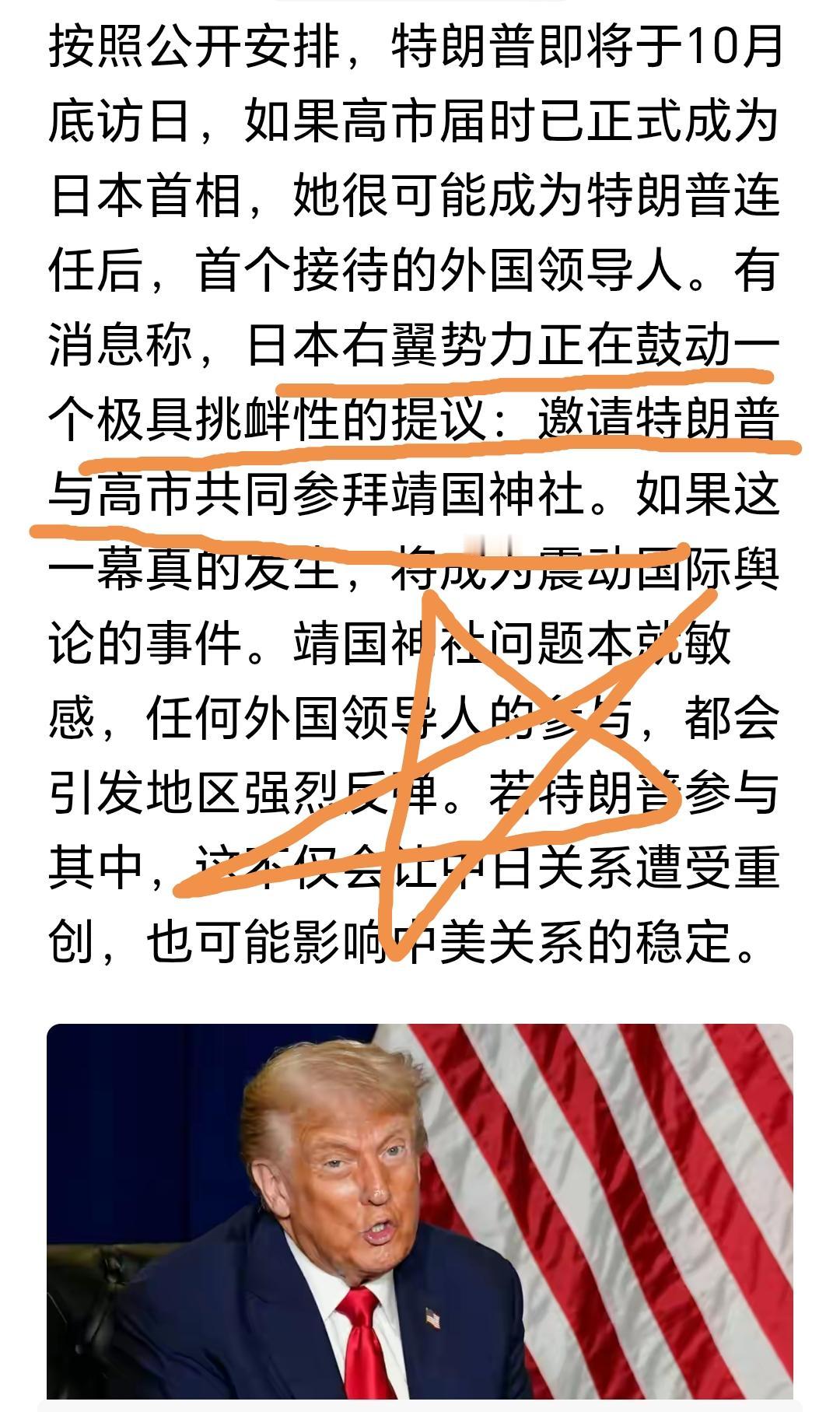 高市上台,小日子的极右翼看来是真想搞事。现在已经在吹风,希望税宗10月底访问日本时,和高市早苗一起参拜靖国神厕。 以赫格塞思之前硫磺岛的发言来看,以税宗现在失智的程度来看,这件事并非完全不可能。 但是,如果这件事情真的发生了,会有什么样的后果? 个人认为可能会严重到和日本断交的情况,会提前收岛。 因为这件事情的本质是宣告二战雅尔塔会议建立的国际体系的崩塌,既然这样,那么我们就必须要出手建立自己的新秩序。 这次和之前小犬拜鬼的意义完全不一样。 当然,如果税宗没有失智到这种程度,就当我没说。 点右上角关注我,我们一起去看这个魔幻的世界