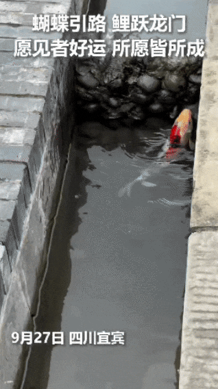 四川宜宾一条锦鲤跳跃石堆时,遇到一只蝴蝶停驻,灵感瞬间闪现,成功越过障碍,这一奇