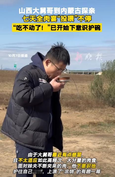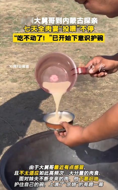 10月7日报道,内蒙古赤峰,一男子趁着假期来看望远嫁的妹妹,没想到,从到了地方开始,就收到了妹夫的硬核招待,七天时间里顿顿都是肉,几天下来,这位大舅哥看到肉都连连摇头。网友:估计下次不敢来了。 张大哥(化名)是山西运城人,妹妹三年前嫁到赤峰。 今年国庆假期,张大哥特意提前调了休,买了高铁票去赤峰看妹妹,本想着能好好聊聊天,还顺便尝尝内蒙的特色美食。 谁知道,妹夫的“热情招待”,把他七天的假期变成了“肉食地狱”。 张大哥到赤峰那天,妹夫开车去高铁站接他。 一上车,妹夫就热情地拍着他的肩膀:“哥,可算把你盼来了!早就准备好给你接风了,保证让你吃好喝好!” 张大哥心里暖暖的,还打趣道:“别太破费,家常饭就行。” 可一到妹妹家,张大哥就明白自己想简单了。 餐桌上摆着一大盆手把肉,油光发亮的羊排堆成小山,旁边还有烤羊腿、一碗热腾腾的羊杂汤,凉菜也都是凉拌牛肉。 妹夫递筷子时还说:“哥,咱内蒙古待客就得吃肉,多吃点,补补!” 张大哥平时在老家也爱吃肉,但看着满桌全是肉,还是愣了一下。 礼貌在先,他还是夹了一筷子开始吃。 原以为接风宴过了几天就能恢复正常饮食,可没想到,从第二天开始,张大哥的餐桌几乎没离开过肉。 早上起来,妹妹端上的是羊肉包子、奶茶配手把肉。 中午不是炖牛排,就是烤羊腿,偶尔换个口味,也是红烧牛肉。 晚上更夸张,妹夫直接在院子里支起烤架,把整只羊腿烤了个香喷喷,还顺手拌了盘羊蹄筋。 张大哥坐在桌前,看着满满的肉,肚子都撑得发胀,但妹夫每次都笑呵呵地劝:“哥,多吃点,别客气,吃饱了才舒服!” 张大哥夹起一块羊排,心里无奈又好笑,原本想着轻松度假,没想到全程都是“肉肉轰炸”。 第二天,妹夫换了花样做牛肉炖土豆、羊肉烧麦。 第三天上风干肉拼盘,顿顿都是硬菜,连片绿叶菜都没见。 张大哥从小习惯面食为主、荤素搭配的饮食,连续泡在肉里,肠胃很快就吃不消了。 到了第四天,看到肉就觉得腻。 探亲第五天,张大哥还感冒了,喉咙干疼,油腻的肉根本咽不下去。 那天中午,妹夫在案板上切羊肉准备做手把肉,张大哥赶紧把碗扣在桌上,摇头说:“兄弟,我真吃不下了,来碗粥就行!” 妹妹在旁边偷笑,把这幕录了下来,视频里张大哥捂着碗“求饶”,妹夫举着刀还想劝:“再吃一块吧。” 其实妹夫并非故意折腾大舅哥。 在蒙古族,牛羊肉是诚意和财富的象征,招待贵宾必须顿顿有肉,让客人吃得饱、吃得开心,这是草原上的待客礼,从成吉思汗时期就沿用至今。 妹夫总说:“大舅哥是娘家贵客,不能怠慢。” 这七天里,妹夫每天天亮就去市场挑最新鲜的肉,变着花样做法,生怕大舅哥吃腻。 但他哪里知道,山西人的肠胃经不起这般“热情”。 张大哥后来开玩笑:“头两天是享福,后五天是渡劫,现在一想到羊肉味都犯怵。” 视频在网上传开后,引来网友一片调侃。 有人说:“这是娘家来人考察生活,一看顿顿吃肉,立马放心了。” 也有人懂行:“山西人爱吃面,突然全肉模式肯定不习惯。”还有人羡慕:“这种‘吃怕了’的待遇,说明被当自家人了。” 虽然吃得累,张大哥心里比谁都清楚,这七天的全肉宴里,藏着妹夫最实在的心意。 虽然“受了点罪”,但这份跨越千里的热情,比任何山珍海味都让人暖心。 对此你怎么看? 信源:新晚报