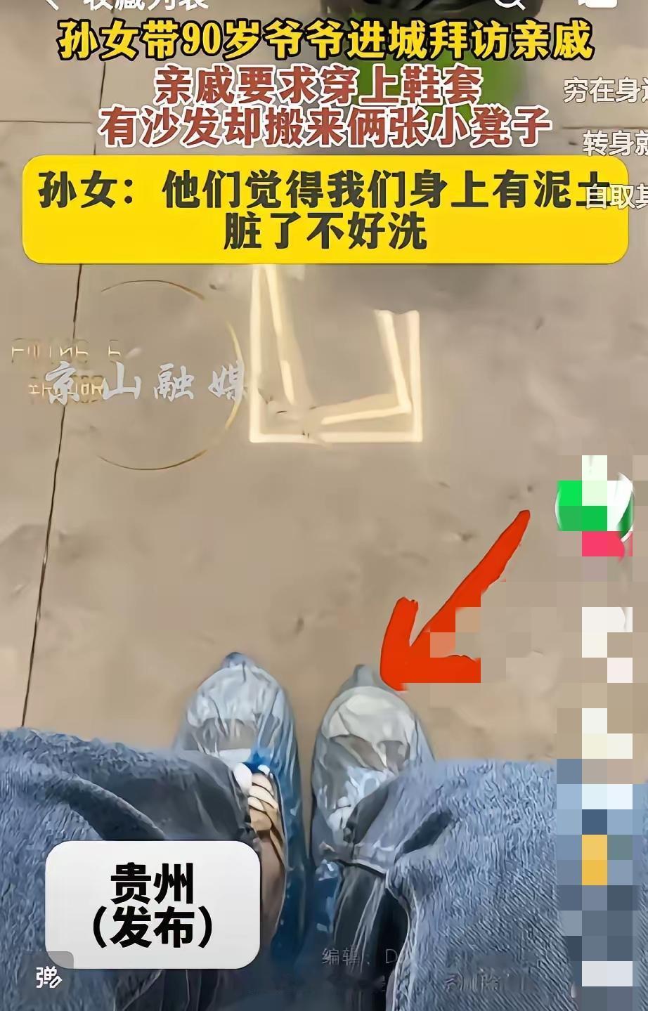 这样的亲戚,还有走动的必要吗? 真的被贵州这位女网友的遭遇气到了!带着90岁爷爷进城走亲戚,本是满心欢喜的事,结果却闹得一肚子委屈。爷爷前一天特意熬夜,用粗糙的双手一针一线扎了个精致的小花篮,就盼着给亲戚一个惊喜,谁能想到刚进门就被要求套上鞋套,说怕身上的泥土弄脏家里。 沙发是别想坐了,亲戚随手搬来两个没靠背的小凳子,让爷爷和她将就着坐。看着爷爷佝偻着腰,穿着鞋套局促地坐在小凳子上看电视,而亲戚一家却横七竖八地躺在沙发上,悠闲自在,换谁心里都不好受。 我觉得走亲戚讲究的是真心换真心,不是用家境和衣着来划分高低。这种把人分三六九等的亲戚,不来往也罢,你们说遇到这样的亲戚,到底该不该断了联系呢?