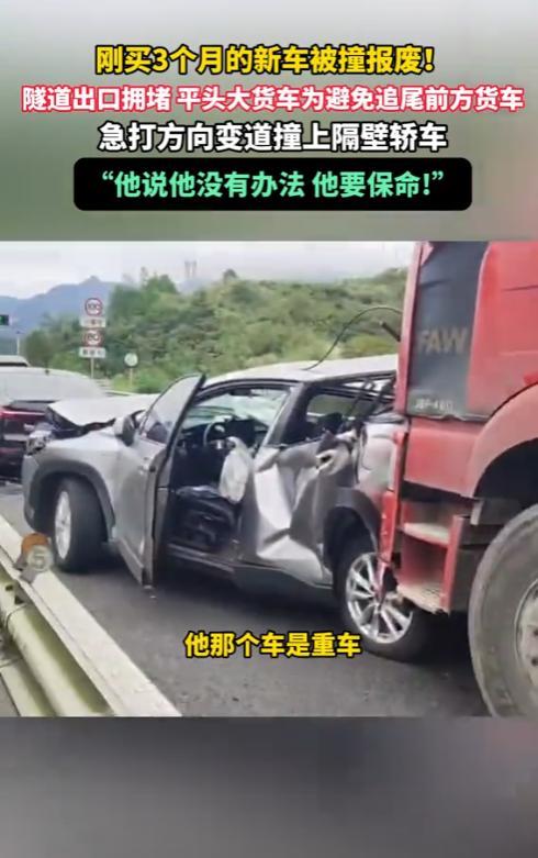 “太自私了!”湖南怀化,一男子开车自驾游,结果刚出隧道,就遇到堵车,他急忙刹车这才没有追尾,就在此时,身后传来了急促的鸣笛声,随即一辆满载货物的货车撞了过来!货车司机:前面的车也装了货,如果不变道撞过来,自己肯定死了。 据南昌晚报10月7日报道,国庆假期期间,高速上车特别多,堵车是常有的事,何先生开着自己刚买了才三个月的新车,带着老婆孩子,高高兴兴地从重庆出发,准备去湖南玩一趟。 车子开到一段高速上,刚从一个长长的隧道里钻出来,外面的光线一下子亮得刺眼,还没等他适应过来,就发现前面的车队全都停下了,红色的刹车灯连成了一片。 何先生心里咯噔一下,赶紧一脚急刹车踩到底,轮胎和地面摩擦发出一阵尖锐的声音,车子总算是在离前车屁股只有一点点距离的地方停稳了。 他刚松了一口气,拍着胸口庆幸自己反应快,没撞上去,可还没等这口气喘匀,他就从后视镜里看到了让他毕生难忘的画面。 一辆巨大的货车,正从他车子后面的车道上,以一个极其诡异的角度,猛地朝着他这边拐过来,那辆货车速度非常快,根本没有减速的意思。 何先生的脑子瞬间一片空白,他只来得及下意识地喊了一声“小心!”,紧接着就是“砰”的一声巨响,整个车身剧烈地晃动,安全气囊瞬间全部弹了出来,打在脸上生疼。 车里的尖叫声、撞击声混成一团,等何先生稍微回过神来,车已经不动了,他赶紧回头看家人,还好,虽然都吓得脸色惨白,但看起来没有受什么重伤。 他解开安全带,推开车门想下车看看情况,结果车门都变形了,费了好大劲才挤出去,下车一看,现场简直一片狼藉。 他的新车,左侧车身已经被撞得稀巴烂,车头也因为连锁反应撞上了前面的车,整个车架都扭曲了,基本上是报废了,而那辆撞他的大货车,斜插着停在他的车旁边,车头也受损不轻。 这起事故还引发了后面好几辆车的追尾,整个路段被堵得死死的,何先生又气又怕,冲到大货车驾驶室旁边,对着那个一脸惊魂未定的司机就吼了起来:“你怎么开车的?会不会开车啊!” 货车司机从车上下来,腿还有点软,他指着前面解释说:“兄弟,你别怪我,我也是没办法啊!” 原来,这名货车司机当时也跟着车流在开,他前面也是一辆满载货物的大货车,因为刚出隧道,视线受影响,加上可能有点走神,他压根没注意到前面已经堵死了。 等他反应过来的时候,距离前车已经非常近了,以他当时的车速和车上货物的重量,就算把刹车踩穿,也绝对刹不住了。 那一瞬间,货车司机脑子里只有一个念头:不能撞!他很清楚,如果自己的车头直接怼上前面那辆大货车的车尾,两辆重车相撞,他的驾驶室肯定会被挤成一堆废铁,他自己是必死无疑。 求生的本能让他做出了一个极端的选择,在不到一秒钟的思考时间里,他看了一眼左边的车道,也就是何先生所在的车道,那里是一排小轿车。 他心一横,猛地向左打了一把方向盘,宁愿撞向旁边的轿车,也不愿意直接追尾前面的大货车,他就这样硬生生地挤了过来,把何先生的车当成了“刹车垫”,最终引发了这起连环事故。 听完货车司机的解释,何先生气得浑身发抖,他指着货车司机,声音都变了调:“你的命是命,我们的命就不是命了吗?为了你自己活命,你就把我们一家老小往死里撞?你这也太自私了!” 周围很多被堵住的司机也围了过来,听了事情的经过,都议论纷纷。 有网友说:“这货车司机简直是‘精致的利己主义者’,两害相权取其轻,他选择了牺牲别人来保全自己,虽然可以理解他求生的本能,但这在道德上和法律上都站不住脚。” 另一位网友则评论道:“这就是典型的‘电车难题’现实版,一边是自己必死,另一边是可能造成别人伤亡但自己能活,说实话,真到那个生死瞬间,谁又能保证自己能做出高尚的选择呢?但无论如何,他的行为已经对别人造成了实质性的伤害,必须承担全部责任。” 确实,这件事让很多人都感到后背发凉,谁能想到,你在自己的车道上规规矩矩地开着车,却可能因为别人的“最优选择”而飞来横祸。 何先生一家这次算是不幸中的万幸,只是车子报废,人没有大碍,但如果当时货车速度再快一点,或者撞击的角度再刁钻一点,后果真的不堪设想。 这起事故也给所有司机提了个醒,尤其是在高速上,注意力必须高度集中,像隧道出口、长下坡这些路段,都是事故高发区,一定要提前减速,和前车保持足够的安全距离。 你永远不知道,危险会在哪个意想不到的瞬间降临,最终,这起事故的责任划分毫无悬念,货车司机因未保持安全车距、操作不当,被判定为全责。 他不仅要赔偿何先生以及其他所有受损车辆的损失,可能还将面临法律的进一步制裁,一场原本开心的假期旅行,就这样以一种惊心动魄的方式提前结束了。 留给何先生一家的,除了报废的车辆和一堆麻烦的后续理赔,还有那段无论如何也抹不掉的惊恐回忆。 信源:南昌晚报2025-10-7