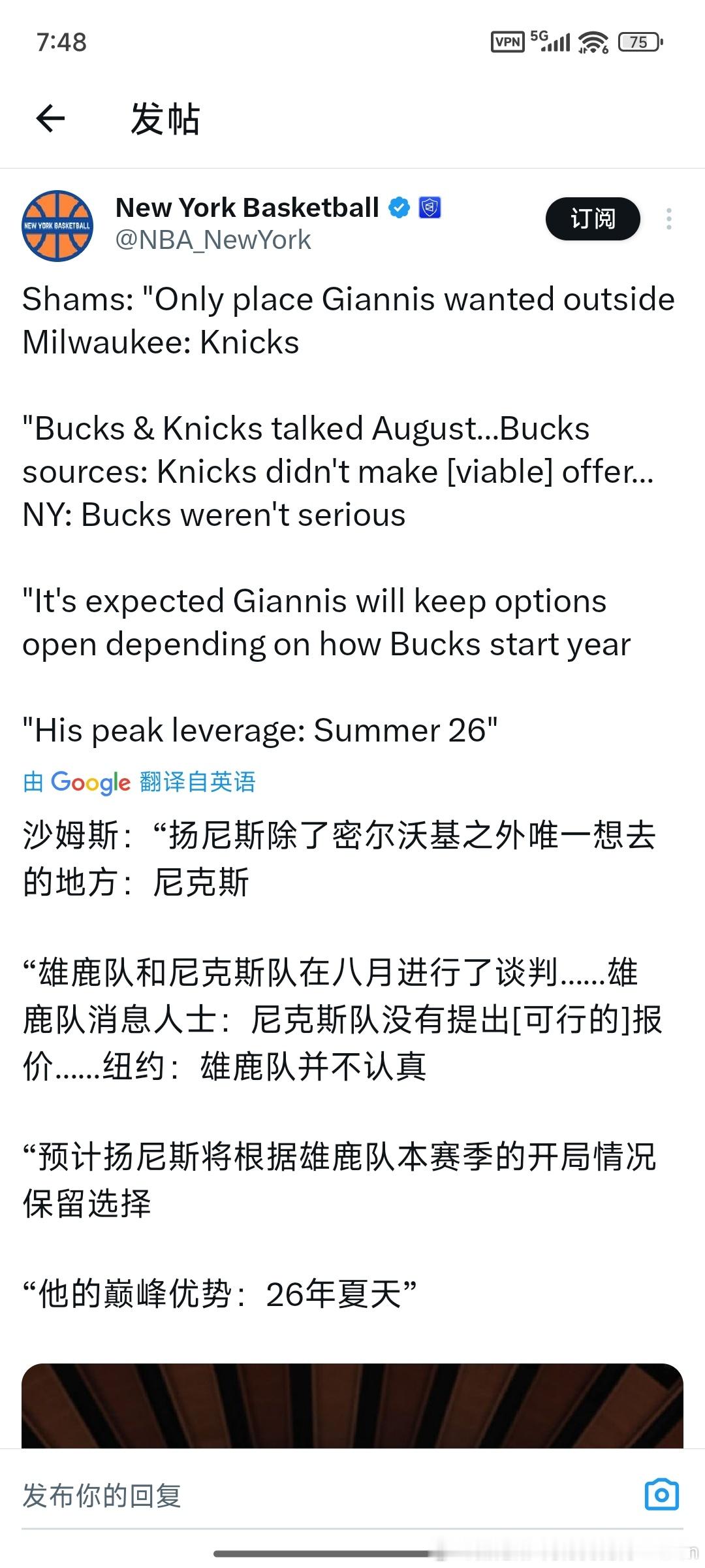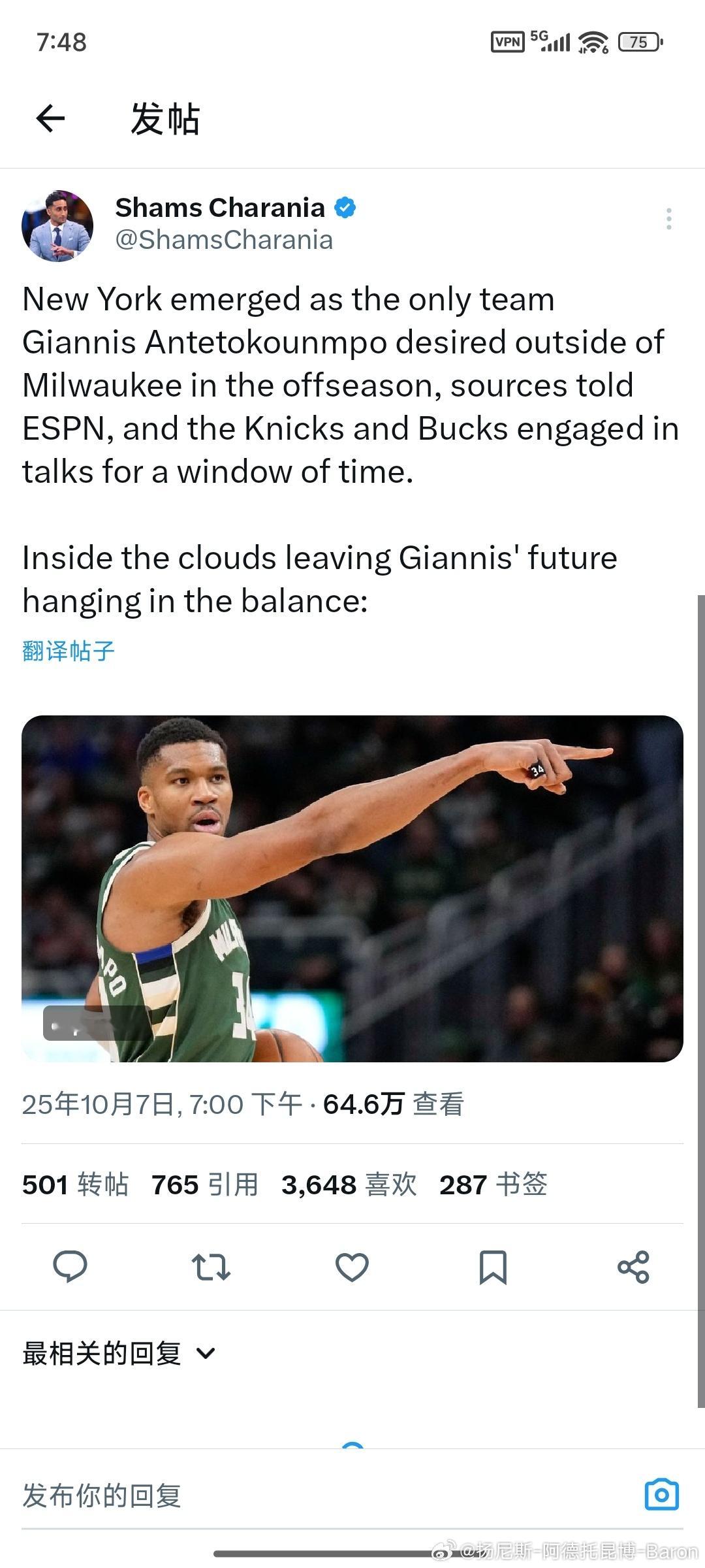 Shams:纽约尼克斯是字母哥在休赛期除雄鹿外唯一渴望加盟的球队,两支球队进行了交易谈判,但尼克斯没有给出足够好的报价,最终未能达成交易!