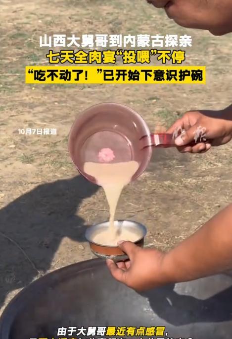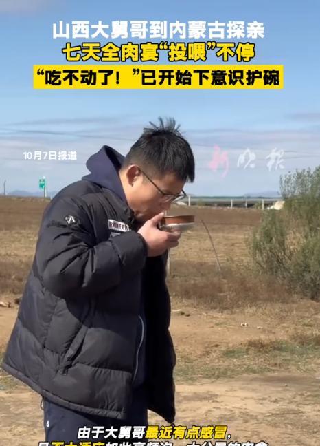 10月7日报道,内蒙古赤峰,一男子趁着假期来看望远嫁的妹妹,没想到,从到了地方开始,就收到了妹夫的硬核招待,七天时间里顿顿都是肉,几天下来,这位大舅哥看到肉都连连摇头。网友:估计下次不敢来了。 张大哥(化名)是山西运城人,妹妹三年前嫁到赤峰。 今年国庆假期,张大哥特意提前调了休,买了高铁票去赤峰看妹妹,本想着能好好聊聊天,还顺便尝尝内蒙的特色美食。 谁知道,妹夫的“热情招待”,把他七天的假期变成了“肉食地狱”。 张大哥到赤峰那天,妹夫开车去高铁站接他。 一上车,妹夫就热情地拍着他的肩膀:“哥,可算把你盼来了!早就准备好给你接风了,保证让你吃好喝好!” 张大哥心里暖暖的,还打趣道:“别太破费,家常饭就行。” 可一到妹妹家,张大哥就明白自己想简单了。 餐桌上摆着一大盆手把肉,油光发亮的羊排堆成小山,旁边还有烤羊腿、一碗热腾腾的羊杂汤,凉菜也都是凉拌牛肉。 妹夫递筷子时还说:“哥,咱内蒙古待客就得吃肉,多吃点,补补!” 张大哥平时在老家也爱吃肉,但看着满桌全是肉,还是愣了一下。 礼貌在先,他还是夹了一筷子开始吃。 原以为接风宴过了几天就能恢复正常饮食,可没想到,从第二天开始,张大哥的餐桌几乎没离开过肉。 早上起来,妹妹端上的是羊肉包子、奶茶配手把肉。 中午不是炖牛排,就是烤羊腿,偶尔换个口味,也是红烧牛肉。 晚上更夸张,妹夫直接在院子里支起烤架,把整只羊腿烤了个香喷喷,还顺手拌了盘羊蹄筋。 张大哥坐在桌前,看着满满的肉,肚子都撑得发胀,但妹夫每次都笑呵呵地劝:“哥,多吃点,别客气,吃饱了才舒服!” 张大哥夹起一块羊排,心里无奈又好笑,原本想着轻松度假,没想到全程都是“肉肉轰炸”。 第二天,妹夫换了花样做牛肉炖土豆、羊肉烧麦。 第三天上风干肉拼盘,顿顿都是硬菜,连片绿叶菜都没见。 张大哥从小习惯面食为主、荤素搭配的饮食,连续泡在肉里,肠胃很快就吃不消了。 到了第四天,看到肉就觉得腻。 探亲第五天,张大哥还感冒了,喉咙干疼,油腻的肉根本咽不下去。 那天中午,妹夫在案板上切羊肉准备做手把肉,张大哥赶紧把碗扣在桌上,摇头说:“兄弟,我真吃不下了,来碗粥就行!” 妹妹在旁边偷笑,把这幕录了下来,视频里张大哥捂着碗“求饶”,妹夫举着刀还想劝:“再吃一块吧。” 其实妹夫并非故意折腾大舅哥。 在蒙古族,牛羊肉是诚意和财富的象征,招待贵宾必须顿顿有肉,让客人吃得饱、吃得开心,这是草原上的待客礼,从成吉思汗时期就沿用至今。 妹夫总说:“大舅哥是娘家贵客,不能怠慢。” 这七天里,妹夫每天天亮就去市场挑最新鲜的肉,变着花样做法,生怕大舅哥吃腻。 但他哪里知道,山西人的肠胃经不起这般“热情”。 张大哥后来开玩笑:“头两天是享福,后五天是渡劫,现在一想到羊肉味都犯怵。” 视频在网上传开后,引来网友一片调侃。 有人说:“这是娘家来人考察生活,一看顿顿吃肉,立马放心了。” 也有人懂行:“山西人爱吃面,突然全肉模式肯定不习惯。”还有人羡慕:“这种‘吃怕了’的待遇,说明被当自家人了。” 虽然吃得累,张大哥心里比谁都清楚,这七天的全肉宴里,藏着妹夫最实在的心意。 虽然“受了点罪”,但这份跨越千里的热情,比任何山珍海味都让人暖心。 对此你怎么看? 信源:新晚报
