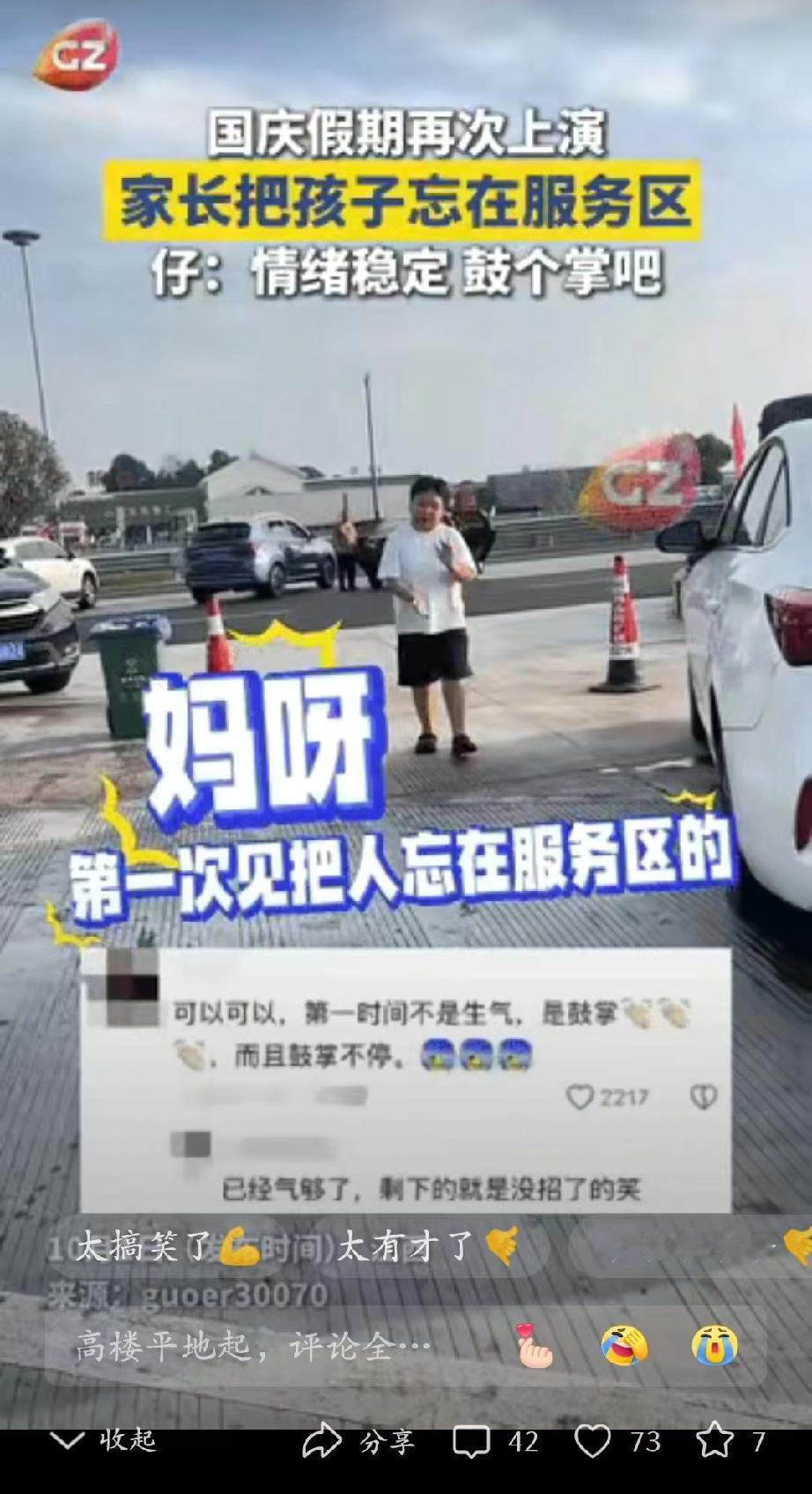 “笑不活了!"男孩在服务区上完厕所,来到妈妈停车的位置, 结果原地转了三圈都没见着熟悉的车牌号!他没哭没闹,就站在树荫下等,一等就是半小时,还时不时踮脚往高速入口望,生怕错过妈妈的车,直到腿都站麻了,才想起掏电话手表联系妈妈。 电话接通时,那头先是愣了好几秒,接着就是妈妈拍大腿的狂笑:“我的天!把你忘服务区了!”等妈妈火急火燎往回赶,一路上还在想“这娃指定得跟我闹一路”,结果见面时,男孩慢悠悠走过来,一边鼓掌一边吐槽:“妈呀,你这操作太绝了,第一次见亲妈把儿子落这儿的!” 评论区全在夸“小孩哥情绪稳”“情商高”,可我越看越心疼——这哪是淡定啊,分明是怕妈妈着急,自己硬扛着害怕! 服务区人来人往,到处是陌生的车辆和行人,他站在那儿的时候,心里肯定慌得不行,只是没说出口而已。更让人后怕的是,万一有坏人盯上,或者孩子乱跑找妈妈,后果根本不敢想! 妈妈那阵笑看着可乐,细想全是侥幸。现在好多家长总说带娃累,想趁停车的功夫“偷会儿懒”,可再累也不能把孩子的安全抛在脑后啊!这不是“粗心”,是没把“看好孩子”当成出行的头等大事。对家长来说,所谓的“片刻轻松”,从来都不能拿孩子的安全去换。 这事儿看着像个笑话,其实是给所有家长敲了个警钟:带娃出门,眼睛就该黏在孩子身上,哪怕只是转身拿个东西,也得先确认孩子在视线里。别等真出了意外,才追悔莫及。 你身边有没有这么“心大”的家长?