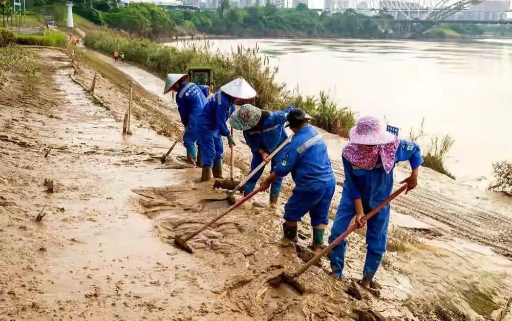 洪水过后,南宁邕江两岸的公园正在清理淤泥。 这淤泥垃圾又全部清回河道,又堵上加堵,明年的今天呢?灾难过后要自救,要作为:疏通河道沟渠植树造林加固河堤,作好防犯,把灾难降到最低限度。