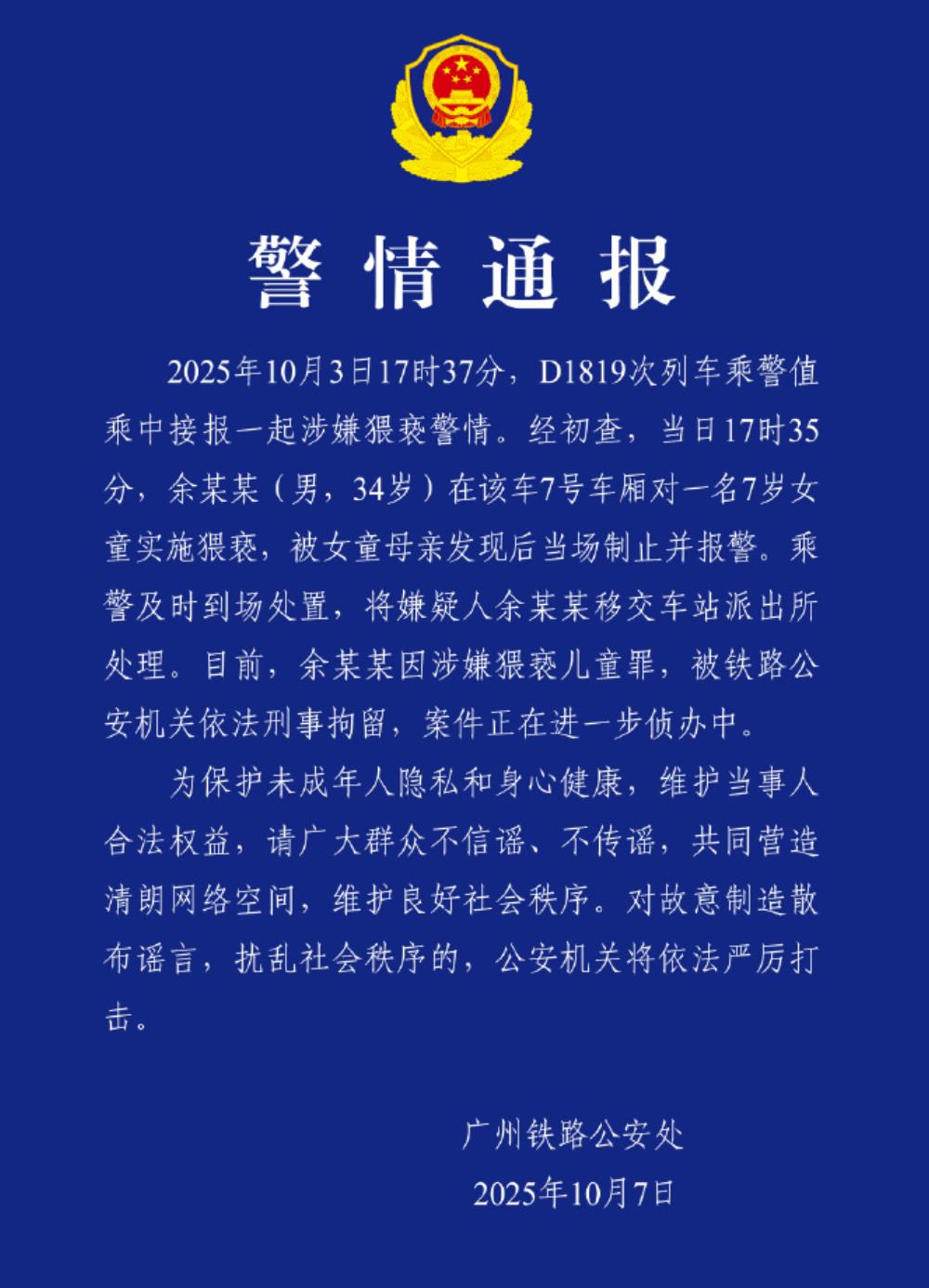10月3日,广州南开往成都东的D1819次列车7号车厢里,一名7岁的女孩落座后,邻座34岁的余某某就开始对孩子动手动脚,触摸、强制搂抱甚至亲吻,孩子害怕不敢言语,周围的旅客都以为男子和女孩是家人。 庆幸的是,很快女孩的母亲发现了,她立即质问男子为何要亲女儿的脸?没想到,该男子厚颜无耻地说看孩子可爱,说自己家那边都可以的。女孩母亲并没有选择不了了之,直接报了警,余某某因猥亵儿童罪被刑事拘留了。 看到这,很想吐槽一件事,就是节假日期间在12306购买火车票,即使大人和儿童一起购票、候补车票,候补成功后还是有很大概率孩子和父母被分配到不同车厢、相隔甚远的座位。未成年人单独和陌生人坐在一排,家长如果不能时刻站在孩子身边,就可能让坏人有机可乘。 如果买到票,家长和孩子被分开,协商调换座位无果的话,家长就受点累,哪怕是站着,也要一直呆在孩子身边。 警惕潜伏在孩子身边的恋童癖,同时也要不厌其烦的告诉孩子:如果陌生人触摸、亲吻自己,一定要第一时间大声拒绝,不要害怕。
