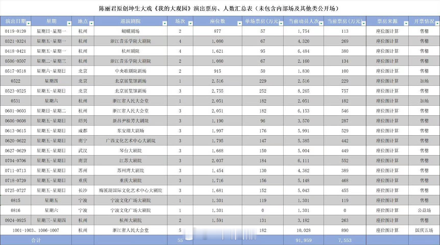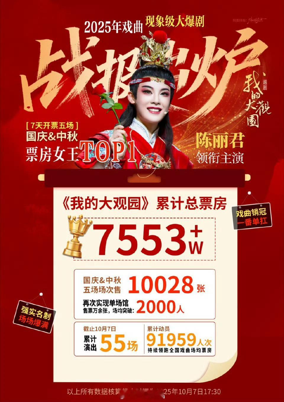 陈丽君《我的大观园》国庆场次售票10,028张,今年目前已演出55场,累计动员91,959人次,累计票房7,553万,领跑全国戏曲场均票房,陈丽君戏永一,票房女王实至名归