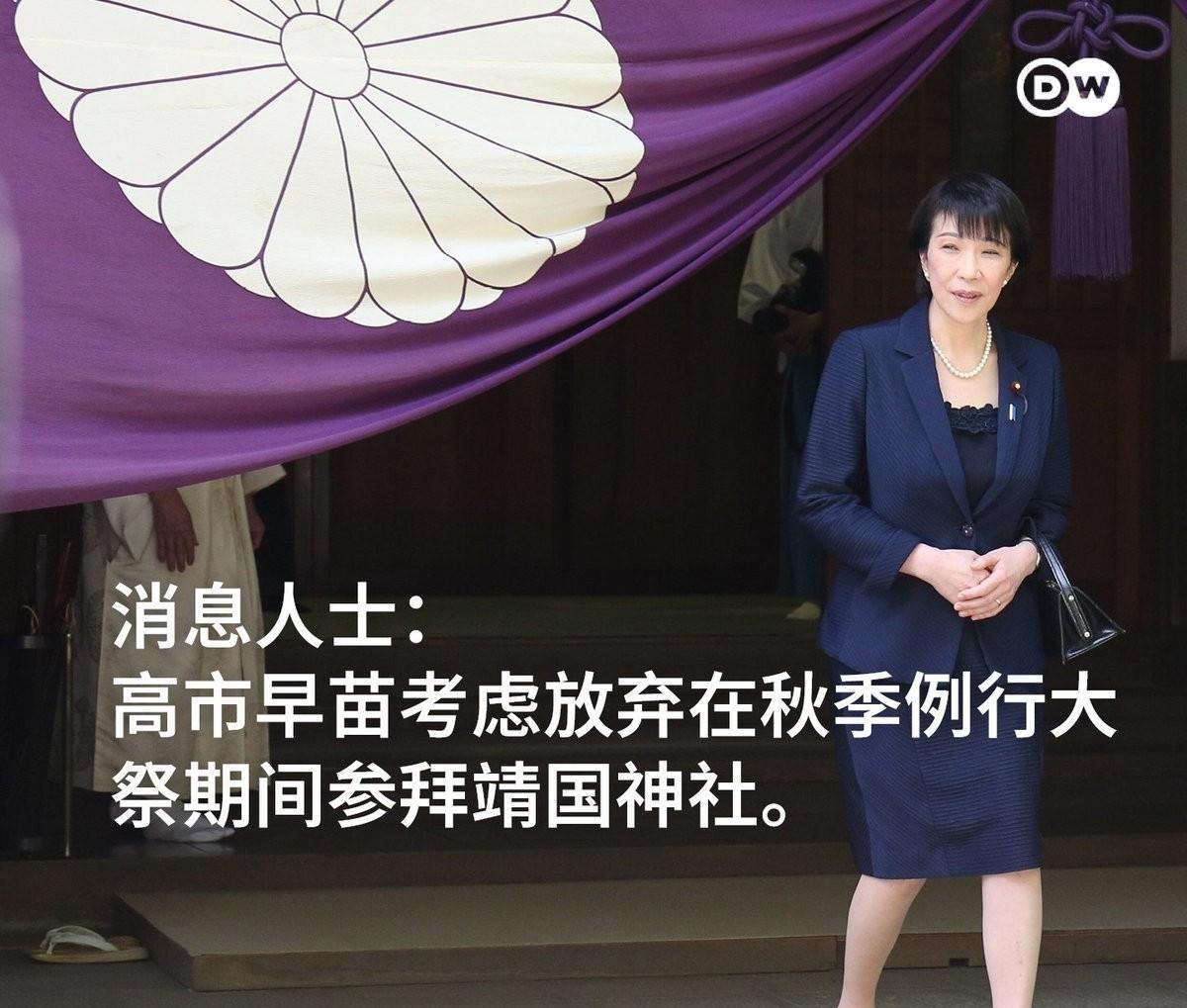高市早苗怂了!10月7日,根据日本共同社报道,日媒援引多名相关人士的消息称,日本靖国神社将于本月17日至19日的秋季例行大祭,日本自民党总裁高市早苗考虑放弃在此期间前往参拜。日媒称,高市早苗认为,继续参拜将不可避免地引发中韩两国的强烈反对,最好避免将其发展成为外交问题。 外媒透露称,高市早苗还希望在韩国APEC峰会期间与中国最高层进行会面。很显然,从高市早苗最新的态度来看,这位多次参拜靖国神社,不承认南京大屠杀及日本731部队的右翼分子明显变怂了。其即将上台后的表现,看起来并没有上台前强硬。 不过,鉴于高市早苗的过往行为,我们不可能看到其行为有所后撤,就改变对其的看法。事实上,如果高市早苗头脑清醒一点,就应该注意到我们到目前为止还没有对其发贺信,而是对其进行了警告,对比当时石破茂胜选,我们发出贺信的态度,这种不同待遇当然不是偶然的。 再者,高市早苗如果希望与我们发展关系,我们也已经指出了明路。其一,高市早苗必须对日本的侵略历史有正确的认识,与过往错误行为划清界限。其二,高市早苗必须在以实际行动兑现一个中国原则,其过往在台湾问题上的表态,严重触碰红线,高市早苗本人必须进行澄清。不参拜靖国神社是不够的,高市早苗也休想对我们打马虎眼。