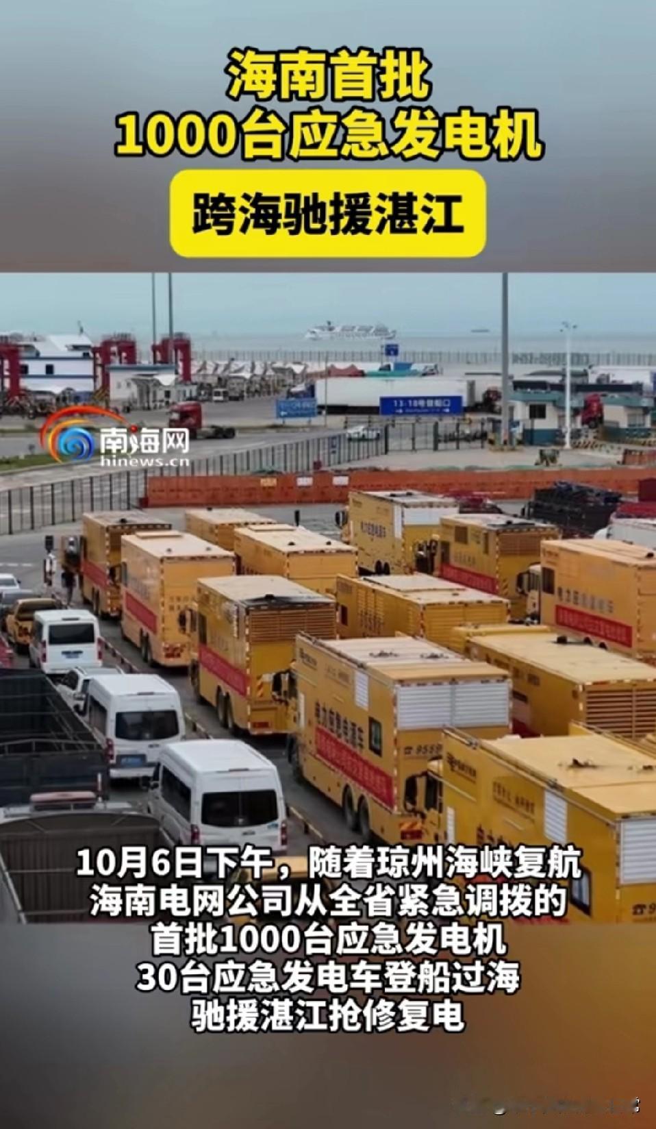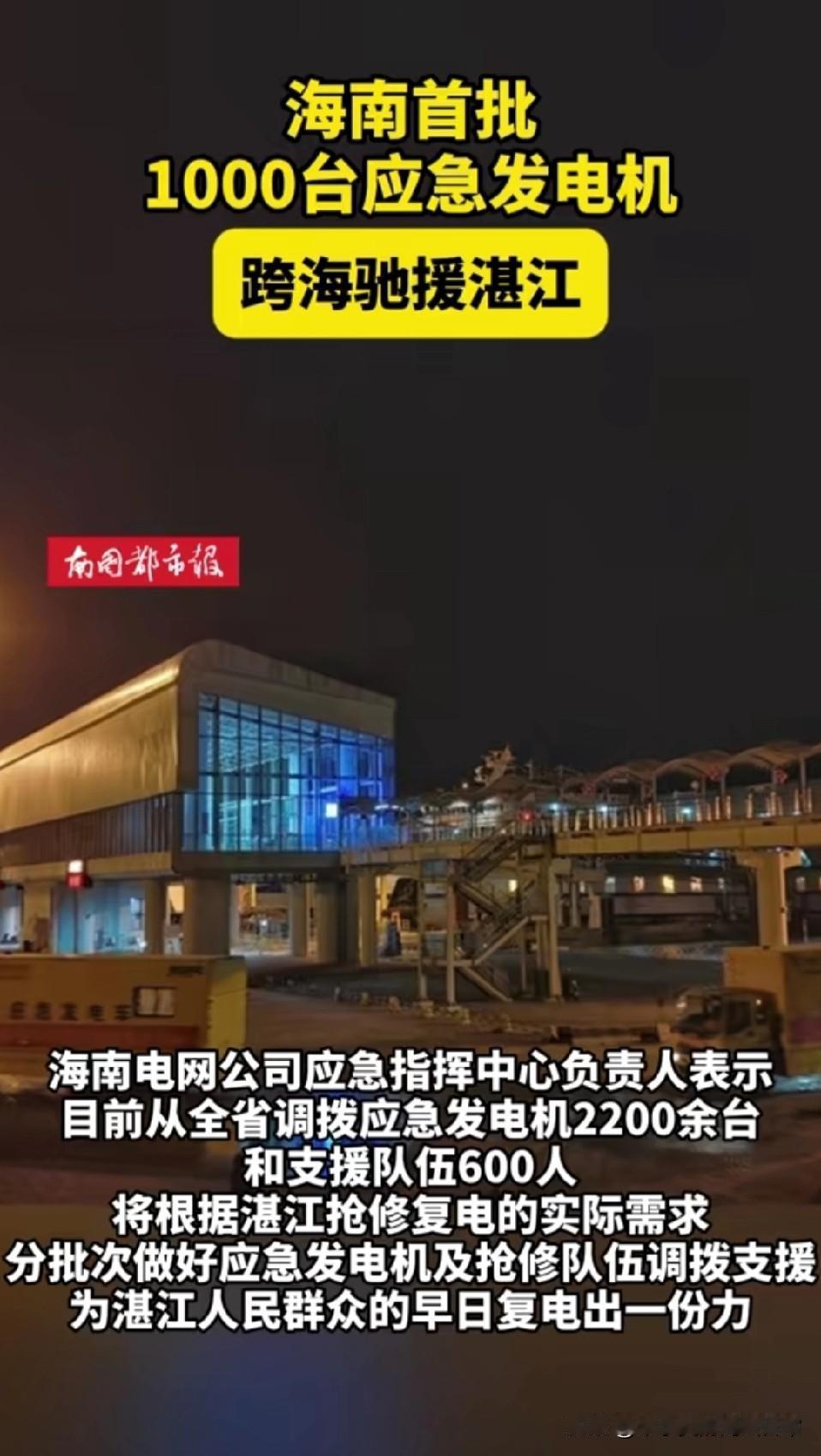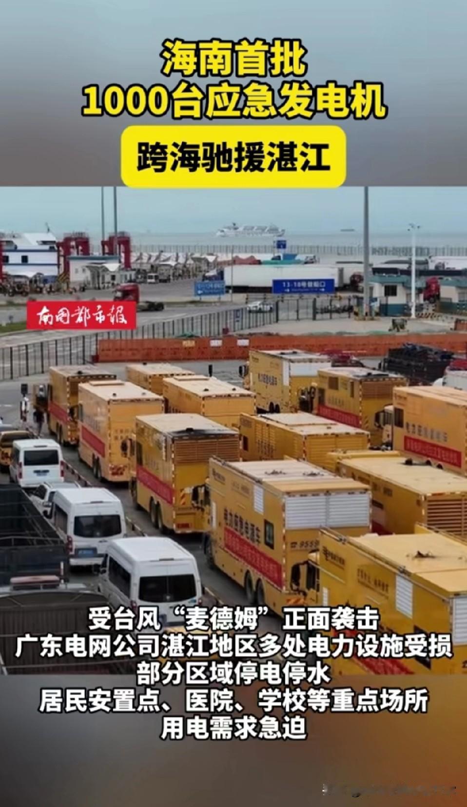 湛江断电断水两天!海南千台发电机跨海驰援 湛江人中秋过得太揪心!台风“麦德姆”正面袭击后,断水断电两天,只能点蜡烛过节。关键时刻,海南1000台应急发电机跨海驰援,这波跨省救援太给力了! 想想湛江同胞在黑暗中过中秋的滋味,就知道电力对生活多重要。海南的驰援就像及时雨,可这背后是台风破坏力的恐怖,也是城市应急能力的大考。 可话说回来,是台风太猛还是城市抗灾能力不足?你觉得面对极端天气,我们的城市防线是该加强硬件还是优化预案?