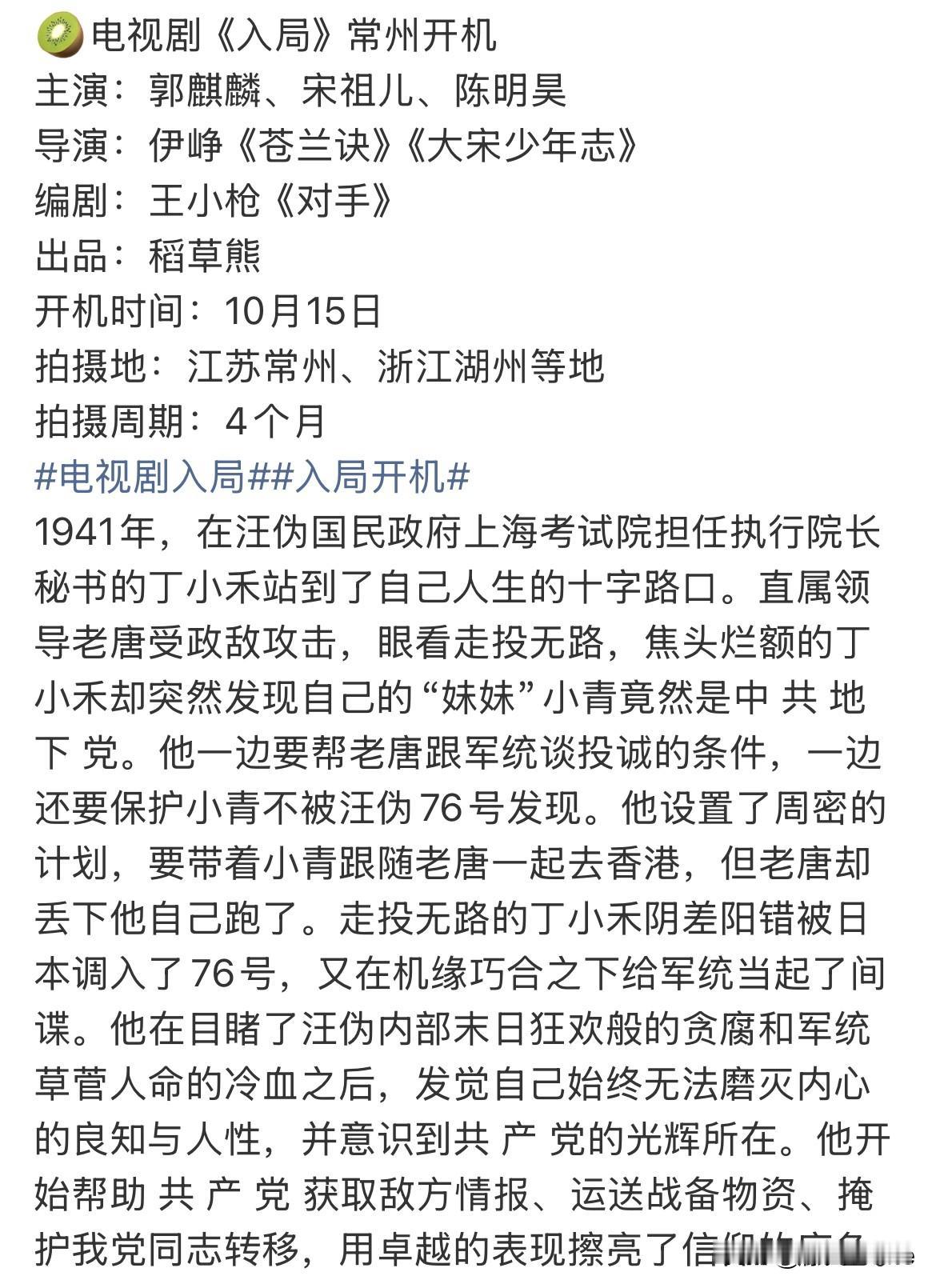 10月7日,郭麒麟宋祖儿合作《入局》,大男主剧,金牌主创班底,强强联合! 可能很