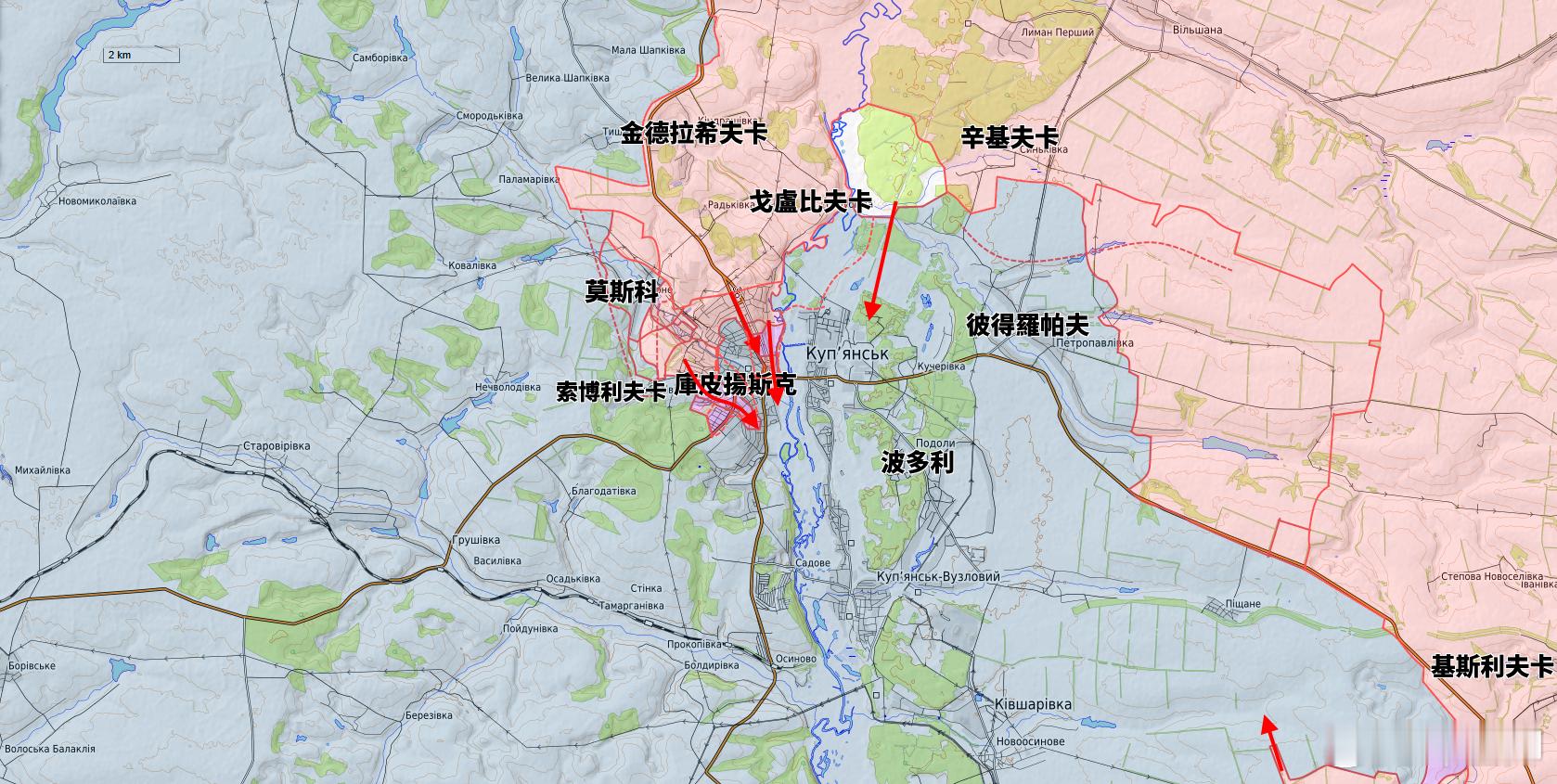根據最新的戰報,俄軍在庫皮揚斯克城區突破了烏軍的防禦,分別從東西二側南下,包圍了市中心的烏軍。