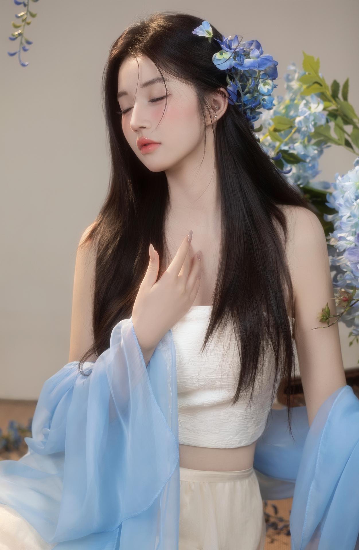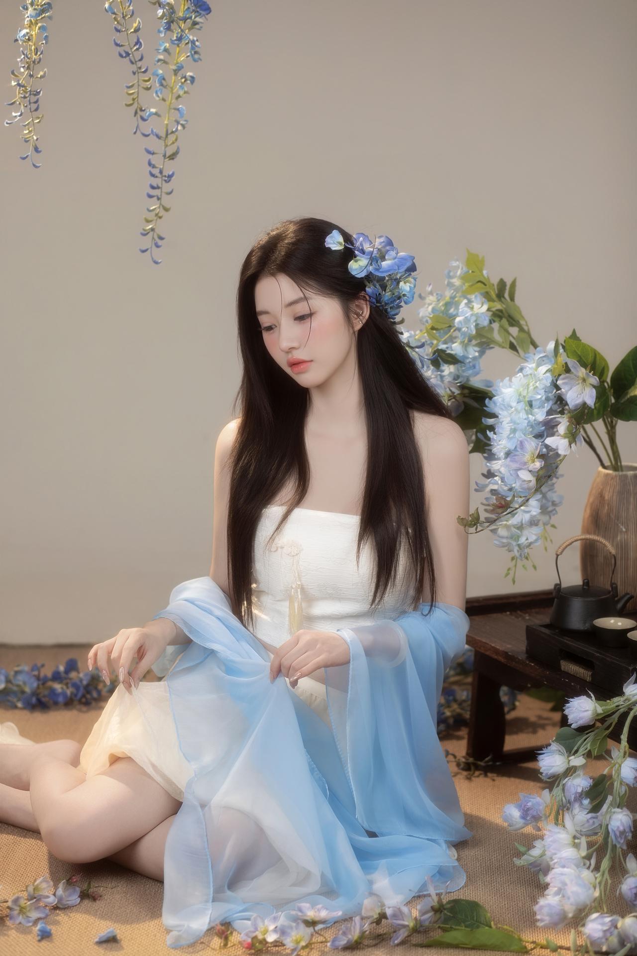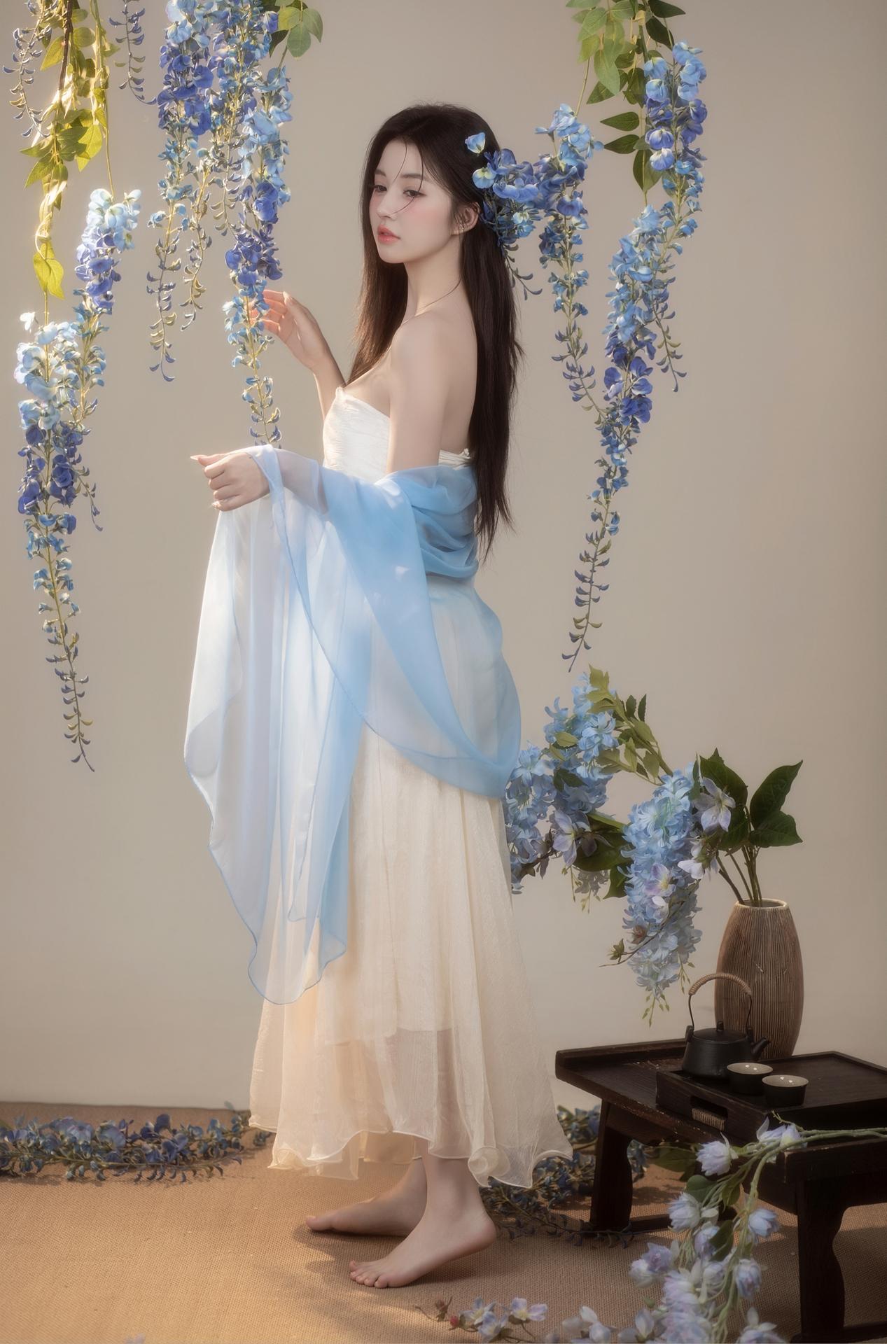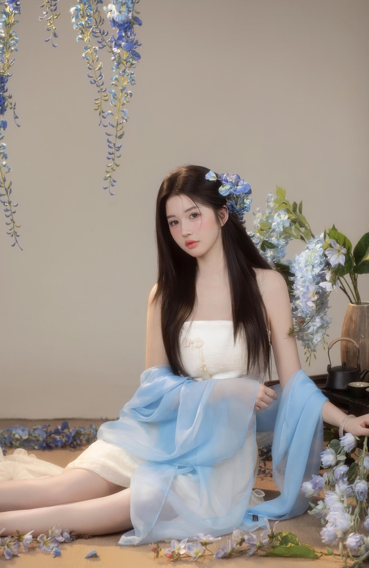 紫藤花开,东方破碎感写真美学|少女写真。🌸垂落的蓝色紫藤诉说柔情 古风典雅的韵味扑面而来 一刹间光阴流转,暗香浮动☁️ 新中式纱裙缠绕过颈间 📷镜头定格清冷氛围 - 新中式写真女子写真写真风格纯欲写真品质写真