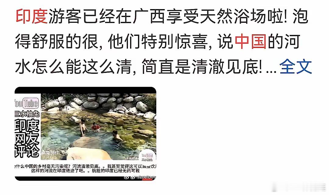 就在最近,人们惊奇的发现,印度人来中国,主要是为了找清澈干净的河水洗澡的。在全国各地,印度人多的地方都发现了,他们一群一群洗澡的画面。河水都被污染了。同一时期,加拿大也发生了这种恶心事。很多印度人在露天洗澡,还抠脚。