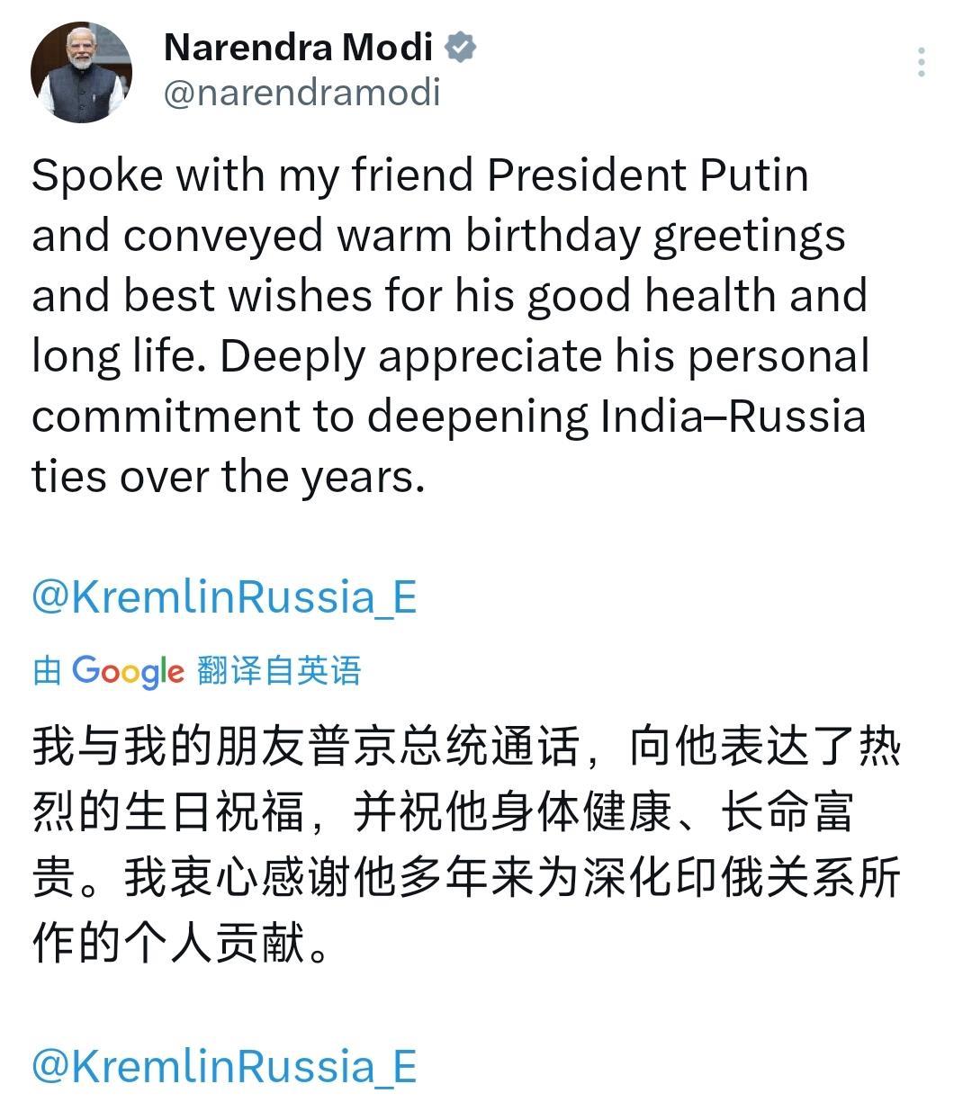 印度总理莫迪昨晚(北京时间10月7日)发文写道:“与我的朋友普京总统通话,向他表