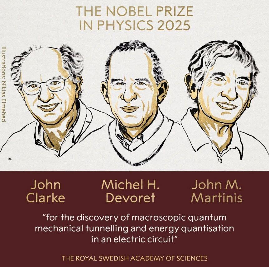 2025年诺贝尔物理学奖公布 2025年诺贝尔物理学奖授予约翰·克拉克 (John Clarke)、米歇尔·H·德沃雷特 (Michel H. Devoret) 和约翰·M·马丁尼斯 (John M. Martinis),以表彰他们“发现了电路中的宏观量子隧穿和能量量化”。