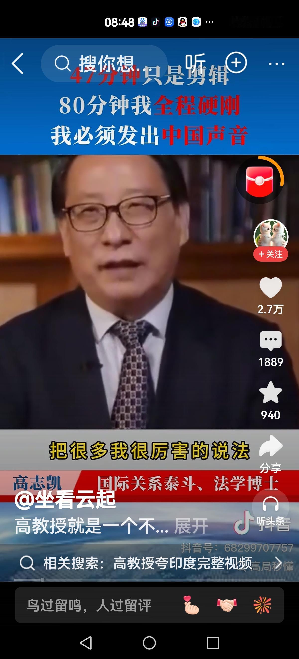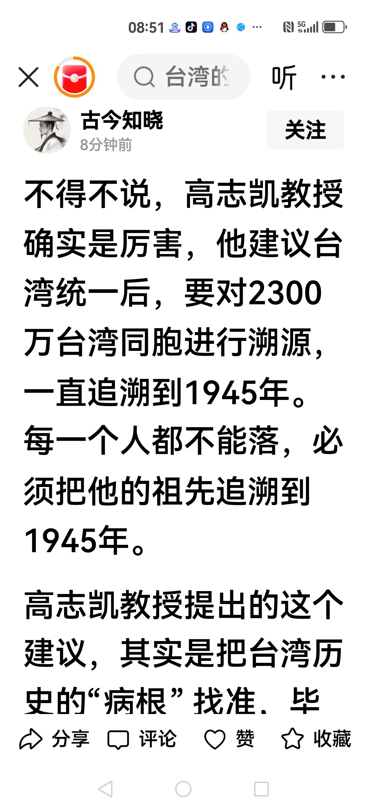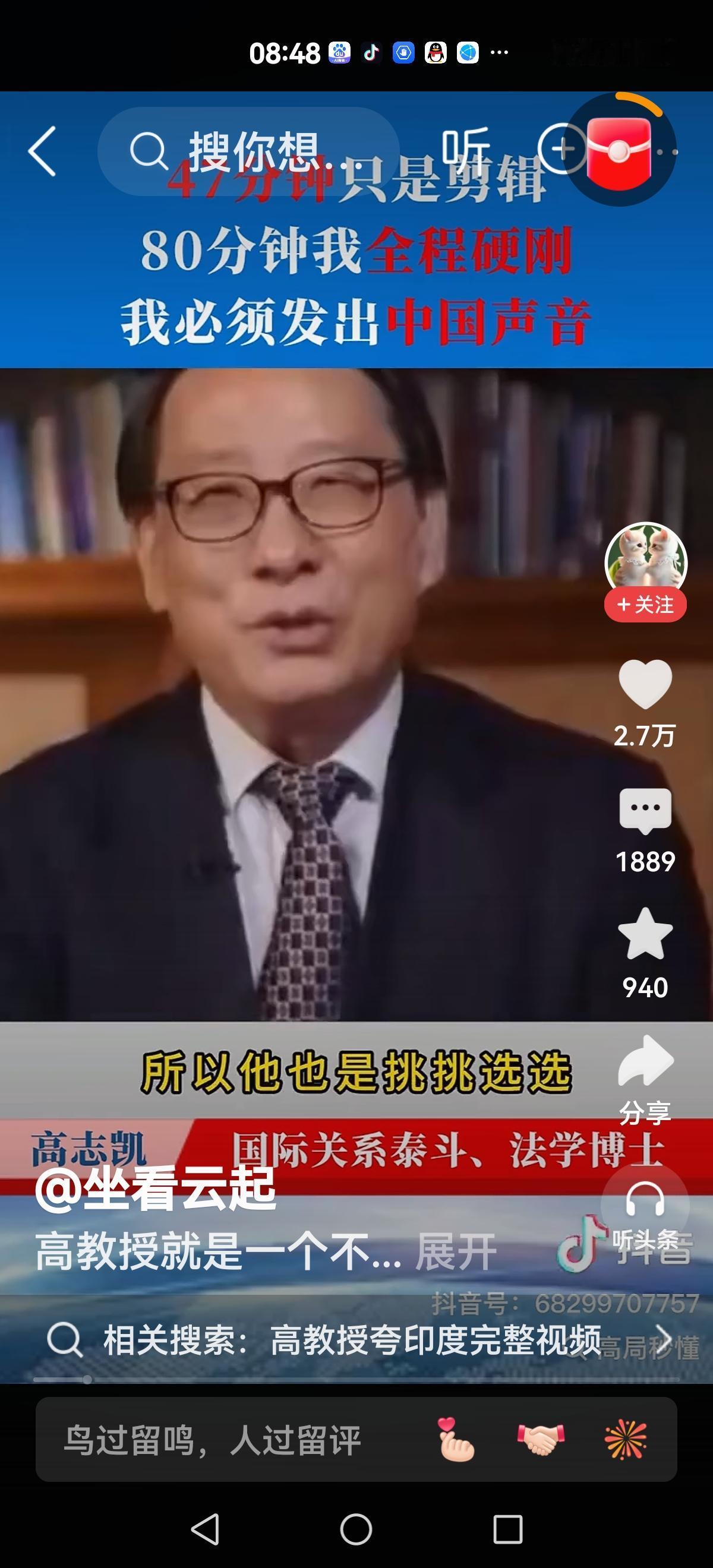 【高教授的铮铮铁骨】 高教授:半岛80分钟采访,最后只播出47分钟,他们也是挑挑拣拣。 把我很多厉害的话语都没有播出,… 高教授最厉害莫过于介绍东风61,有61颗分弹的加一颗氢弹,如果真的是这个技术规格,那是世界无敌。 美国西方听到这个信息,估计都要保持沉默了。 另外高教授还说:湾湾2300万收回后要溯源,追溯到1945年,看看都在干嘛? 这番言论着实让人后背发凉?