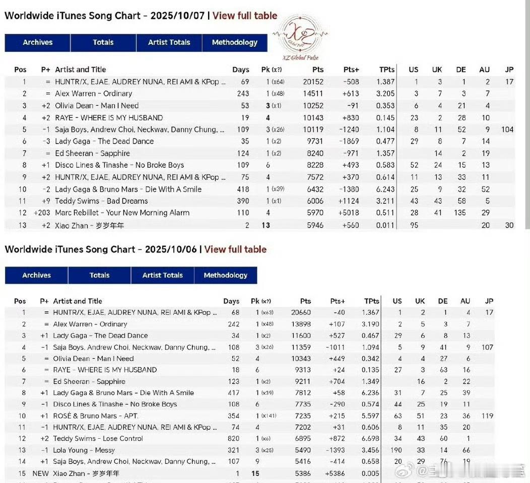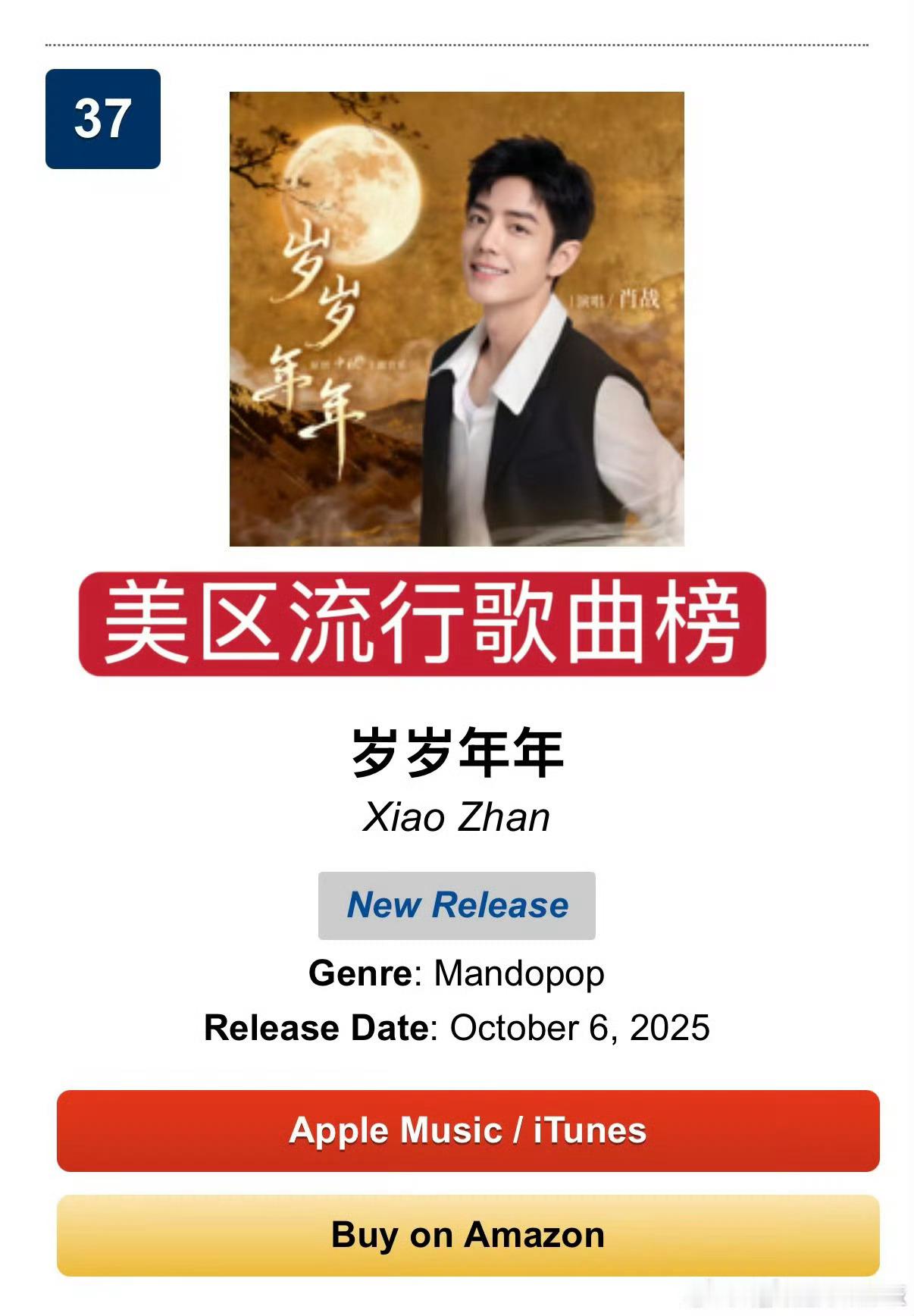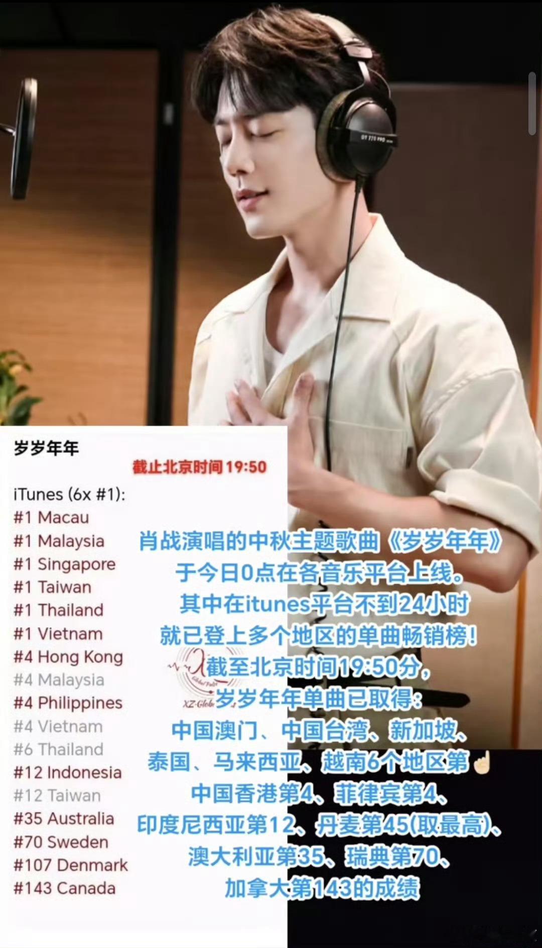 肖战岁岁年年又在itunes全球单曲榜上升两位,主旋律歌曲出现在国际榜单这个事情真的很神奇,肖战的国际影响力真的非常🐮