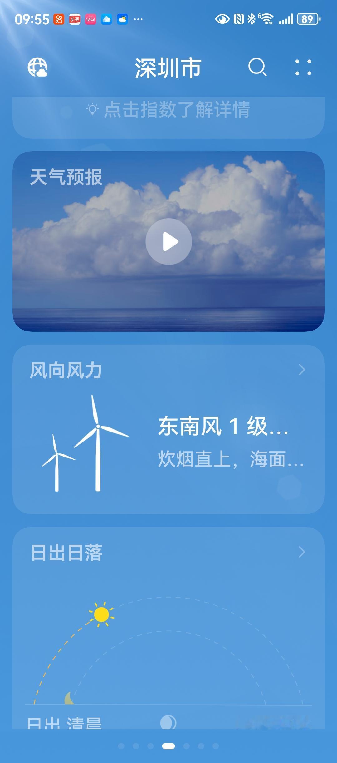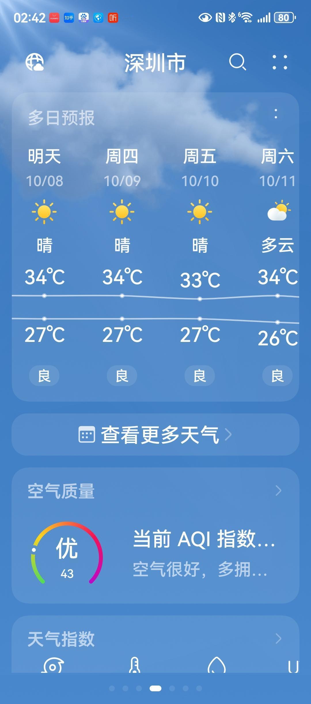 今年这个天气有点怪,已经到了寒露时节,深圳的热丝毫未减,比盛夏的那时还热。七八月按往常是最热的时节,那个时候一天不停地刮风,我们真没开空调。这几天晴空万里,太阳高照,风力很小,非常热,不得不开空调了。