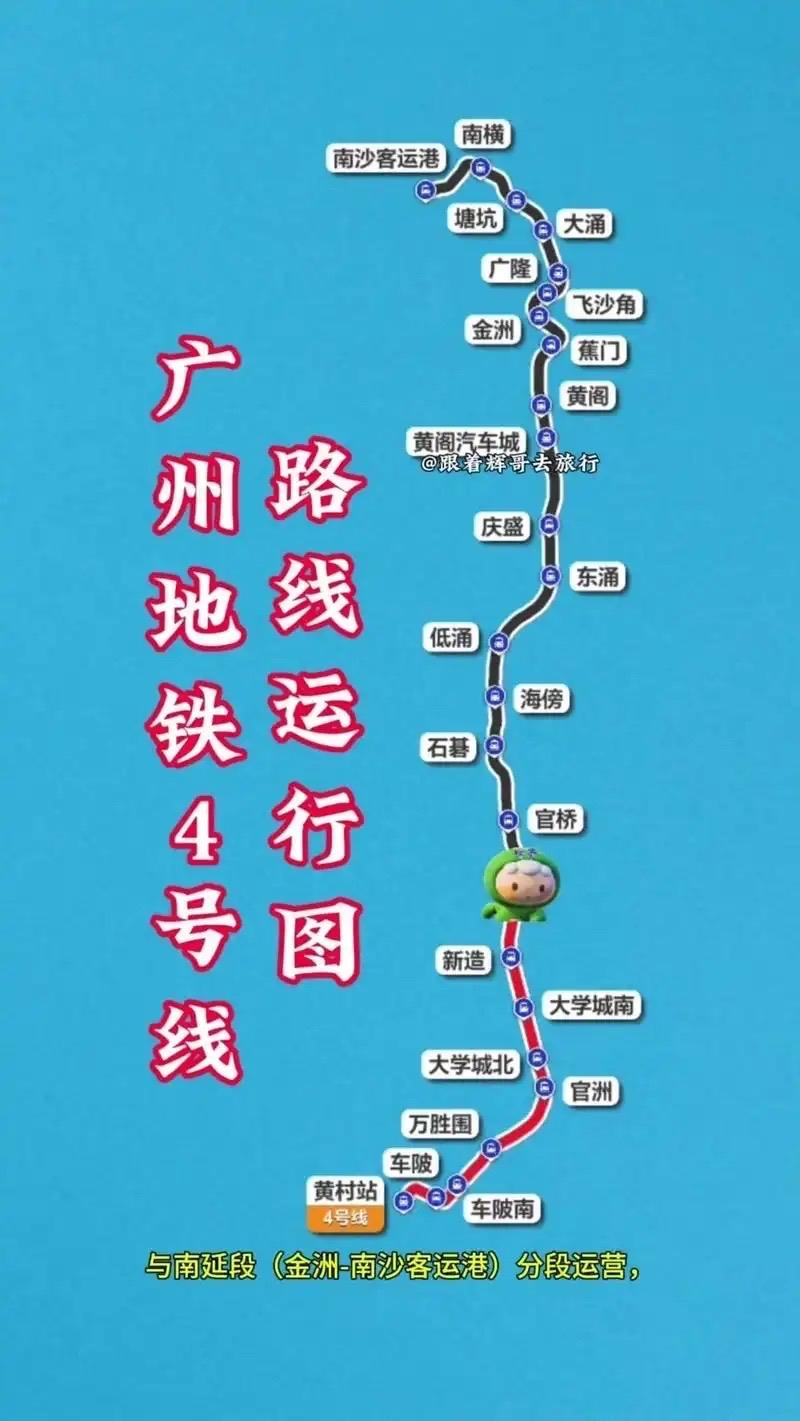 广州地铁4号线 广州地铁4号线是贯穿广州市区与南沙区的重要南北向线路。 广州地铁4号线起于黄村站,途经天河区、海珠区、番禺区、南沙区,止于南沙客运港站,大致呈南北走向;广州地铁4号线全长60.03千米,共设24座车站(其中有1座为预留站官桥站),其中14座地下站,10座高架站,采用4节编组L型列车。 换乘站点 车陂南站:换乘5号线 万胜围站:换乘8号线及海珠有轨1号线 大学城南站:换乘7号线 黄村站:换乘21号线 庆盛站:可换乘广深港高铁(香港西九龙方向) 南沙客运港站:目前广州地铁收车最晚的站点之一(末班车00:21) 大学城区域:大学城北、大学城南站为高校集中区 生物岛:官洲站附近聚集科研机构 4号线复线(光谱东路—万顷沙枢纽)已规划,设计时速160km/h,将提升南沙与市区通行效率。地铁4线 4号线地铁线 地铁4号线在建 4号线沿线 广州站地铁
