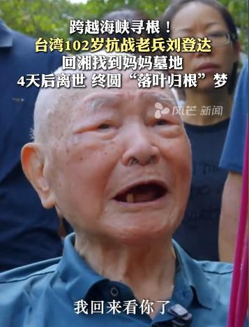 台湾102岁高龄的湖南籍抗战老兵刘登达,在阔别多年后跨越海峡回到大陆祭祖。不幸的是,10月1日他在返回台湾的途中,于福州转机时离世。 2025年10月1日的福州长乐国际机场,深秋的凉意正透过航站楼的玻璃往里钻。 广播里重复着登机提醒,102岁的刘登达被志愿者搀扶着刚踏上舷梯,突然身子一沉,双手紧紧抓着座椅扶手。 医护人员赶来时,老人浑浊的眼睛还望着窗外,那个方向,是他刚刚离开的湖南老家。 经过半小时紧急抢救,这位跨越海峡寻根的抗战老兵还是闭上了眼睛。 网友们说,这是老人舍不得走,终究要把自己留在这片他守护过的土地上。 这位老人的一生,都被“回家”两个字牵动着。 1923年,刘登达出生在湖南岳阳临湘与湖北通城交界的小山村,家里排行老三。 16岁那年,因为刚结婚的哥哥不能离家,他穿上军装替兄从军,跟着部队在浏阳大围山、新墙河一带打游击战,枪林弹雨里好几次差点丢了性命。 1946年,他登上赴台的船,身上只带了一身旧军装,没想这一去就是七十多年。 1988年,两岸开放探亲,刘登达第一次回到老家,才从亲人嘴里得知,母亲早在他从军后不久就被日本兵残忍杀害了。 看着父母荒草丛生的坟头,连墓碑都快被泥土埋住,他蹲在地上哭了很久,那时就暗下决心,百年后一定要葬在母亲身边。 可因为身体和手续原因,这个心愿一拖就是几十年,兄弟姐妹也陆续散在岁月里,他在台湾无儿无女,只剩对故乡的念想。 七十年的等待,终究敌不过岁月,但回家的路,他还是走完了。 2025年9月25日,在两岸志愿者的帮助下,刘登达辗转飞机、高铁,终于抵达湖南衡山西站。 几十位从没见过的家乡亲人挤在出站口,举着写有他名字的纸牌。 人群中有人喊了一声“三爷爷”,老人的眼泪一下子就涌了出来,皱纹里藏着笑意,眼泪却顺着眼角的沟壑往下淌。 接下来的几天,成了刘登达这辈子最踏实的时光。 亲人带着他在村子里转,指着老房子的地基说“这是你小时候住的地方”,帮他在父母的坟前摆上祭品、烧了纸钱。 志愿者还特意为他补办了百岁生日宴,寿桃摆在正中间,他捧着碗抿了一口米酒,反复说“回家真好,回家真好”,还盼着明年能再回来看看稻子熟。 没人想到,这份喜悦只维持了短短几天。 10月1日返程时,老人在福州转机突发意外,最终没能再回到台湾的住处。 10月6日,亲友们按照他的遗愿,把他安葬在岳阳老家母亲的坟墓旁。 墓碑立起来的那一刻,有人想起余光中那句诗,乡愁是一方矮矮的坟墓,我在外头,母亲在里头。 而刘登达,终于不用再隔着海峡思念母亲了。 老人走了,但他的故事撕开了一个更值得深思的现实:两岸还有数万像他这样的抗战老兵,年轻时背井离乡保家卫国,老了想回家却步履维艰。 刘登达的离去,是一个圆满的遗憾,他终究没能实现“再回家看看”的愿望,却以最彻底的方式完成了落叶归根。 而我们更该记住的是,对老兵的尊重,不该只停留在感动和缅怀里。 刘登达终于不用再漂泊了,而我们的责任,是让更多“刘登达”不用在等待中留下遗憾,让这份跨越海峡的家国记忆,能在代际间永远传递下去。 信息来源:风芒新闻2025-10-07发布视频