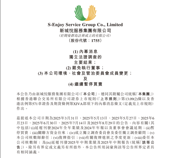 9月30日,新城悦服务发布一则公告,公布了2023年和2024年公司违规资金往来的调查结果。