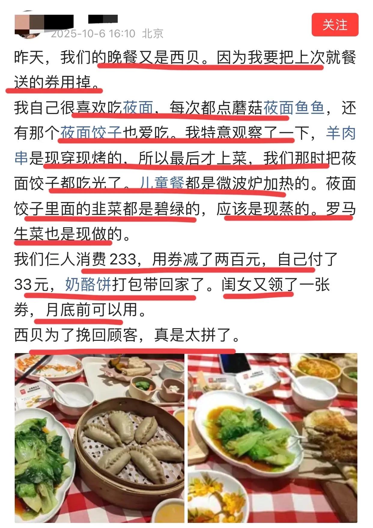 国庆在西贝吃饭后的感受~ 文案都一样的,图片也差不多~ 你们搞公关的,能不能用心一点呢? 都是吃233元,优惠了200元,最后付款33元,这也太巧了吧,难道你们在不同城市吃饭时商量好点一样的菜?饭后发的感叹也基本是一模一样!? 确实,太会玩了!! 我的天,你们把网友当什么了?? [笑哭][笑哭][大笑][大笑][赞][赞]
