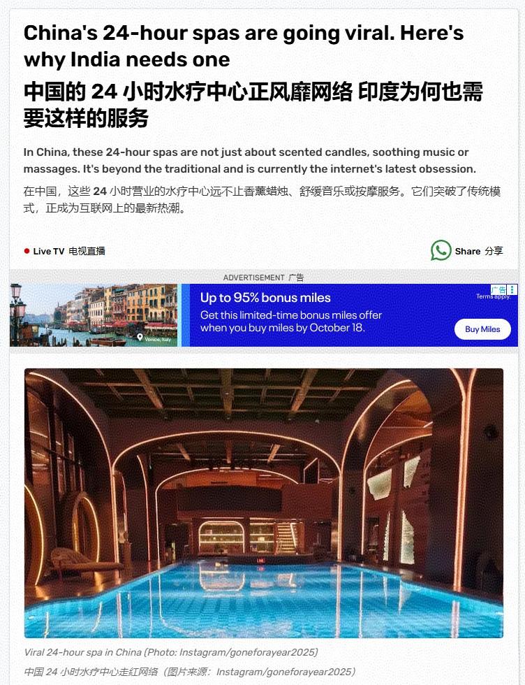 印度人开始羡慕中国的“汤池”文化,希望有一天能够便捷体验“汤池”。实际上,“汤池”文化在中国并不像印度媒体这篇报道一样遍地开花,也不是所有中国人都喜欢随时走进一家洗浴中心(泡脚更常见些),但确实常见。印象中广东人特别喜欢汤池文化,很多生意都是在汤池里面谈成的。可能是大家在“泡澡”的时候坦诚相见,彼此之间更愿意谈一些深度合作的问题,所以广东人的生意做的好,商业最发达。而我们这类上班族,不喜欢到城市里面的洗浴中心,一般是隔三差五,到周边的温泉酒店小住一下,先去酒店旁边的健康步道走两小时,回来后泡一小时温泉,晚上睡觉睡眠质量特别好。