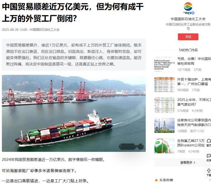 为什么中国的贸易顺差已经接近1万亿美元了,但外贸企业却还一批又一批地倒闭?这么说吧,大量外贸企业倒闭,实际上正是我们正在把西方的工业挤出市场的证明。 沿海有一家做牛仔裤的厂,老板干了二十多年,从小作坊熬成出口大厂,那时候订单只怕接不完。 如今客户不再追求便宜货,反而要各种环保材料和复杂工艺,价压得低,利润几乎没了。 银行更是态度一变,不愿意给贷款,他咬牙买了高端设备想翻身,结果客户提的要求根本做不到,最后设备只能贱卖,工厂也只能关停。 同一时间,不远处的码头却是另一种景象,巨大的滚装船一次能装几千辆国产新能源SUV发往欧洲,价格比当地燃油车便宜,性能还更好。 消费者用脚投票,欧洲车企的订单就这样被抢走。在南方的大船厂,工人们建造着能卖到两亿美元一艘的液化天然气船,这种过去由韩国垄断的船型,如今中国不仅自己造,还能比别人更快交货。 自动化生产线上,机器人取代了大量工人的岗位,但产值却飙升。 为什么会出现这种冰火两重天?因为银行更愿意把钱借给有专利、有技术的企业,而不是依赖人力和低价订单的老工厂。 地方政府也在换赛道,优先给高科技企业地皮和政策,让传统产业尽快搬走。欧美消费者的口味也变了,追求可溯源、环保、小批量的产品,大批量走量的模式不再吃香。 面对这些变化,很多中小外贸企业就像在原地跑步,眼看别人高速向前,自己却跟不上节奏。但这场淘汰,不只是国内的产业升级,更是全球市场的重新洗牌。 中国的高端产品在世界舞台上打开了缺口,河南的手工提琴直接卖到欧洲音乐厅,沧州的化妆刷霸占了全球高端大部分市场。 这些靠技术和品牌撑起的生意,不怕关税、不怕竞争,反而趁着西方老牌工业衰退的时候迅速占位。 那些倒下的厂子,是过去靠数量堆出来的产能;那些活下来的,是能和西方高端工业正面较量的企业。 近万亿的顺差,正是这场产业换血的结果。外部的杂音,比如赖清德的政治表态,也改变不了这个现实真正决定未来的,是谁在产业和技术上握有主动权。 中国的这场转型,注定会让一些旧行业消失,但也会让新的力量站上全球的中心。