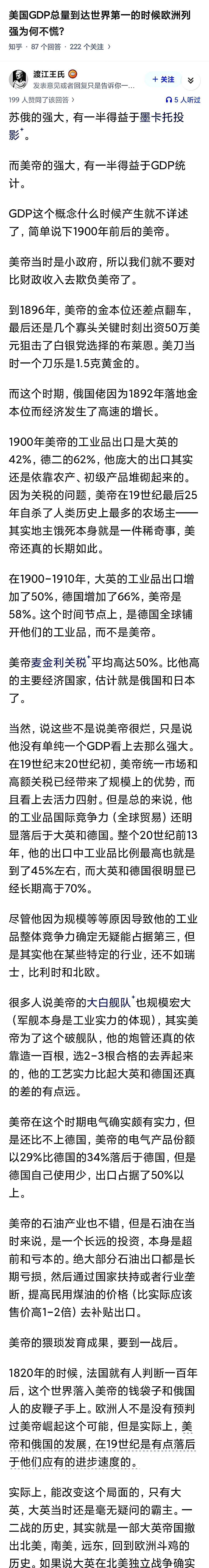 美国GDP总量到达世界第一的时候欧洲列强为何不慌? 事实上,美国1900年地位并不高,真正的世界核心还是英法德西欧这票列强。 经济地位主要看外贸,外贸还是英法老牌+后起之秀德国厉害。 科技看德国,金融看伦敦,国际货币依然英镑。 文化甚至也不是美国,好莱坞都是后来的事,此时欧洲正流行南美巴西阿根廷的文化。 美国只是一个稍大号巴西,巴西此时不比美国差。 美国人欧洲也不待见,嫌没文化,类似今天中国人看黄毛。 所以美国暴发户爱去欧洲找破落贵族女好抬高自己。 最终还是两次世界大战改变了一切。 虽说一战后美国国力大幅增长,甚至美国都开始幻想平分大英的海权[捂脸]。 但那时的欧陆国家还是看不起美国的,美国依然还是二流国家。威尔逊在巴黎和会上也只是旁观者,规则还是英法主导。 结果就是巴黎和会英法联手把美国这个上桌的老鼠赶下台。 后面美国用了20年支援苏德日解体英法的霸权。 只是肢解英法霸权过程中让日德玩脱了而已~