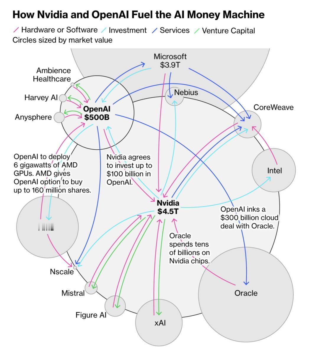 最近一些天,美国人变成了资本市场上的吹牛逼大王。以OpenAI的惊天牛皮为核心,直接涉及了英伟达、AMD、甲骨文的万亿美元意向合同,和几乎所有美国IT巨头都产生了关联,还有博通、软银等无数在人工智能产业链上从硬件、软件、到资本的全球公司。