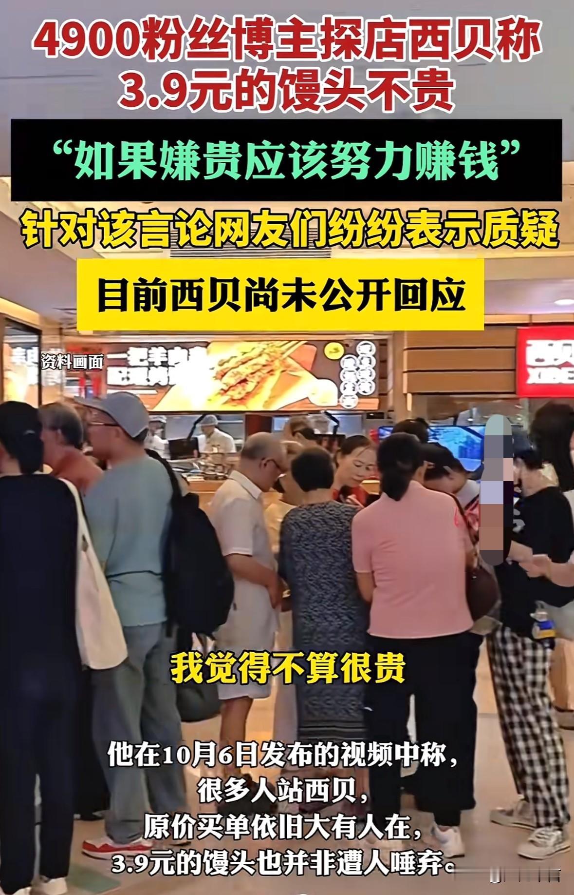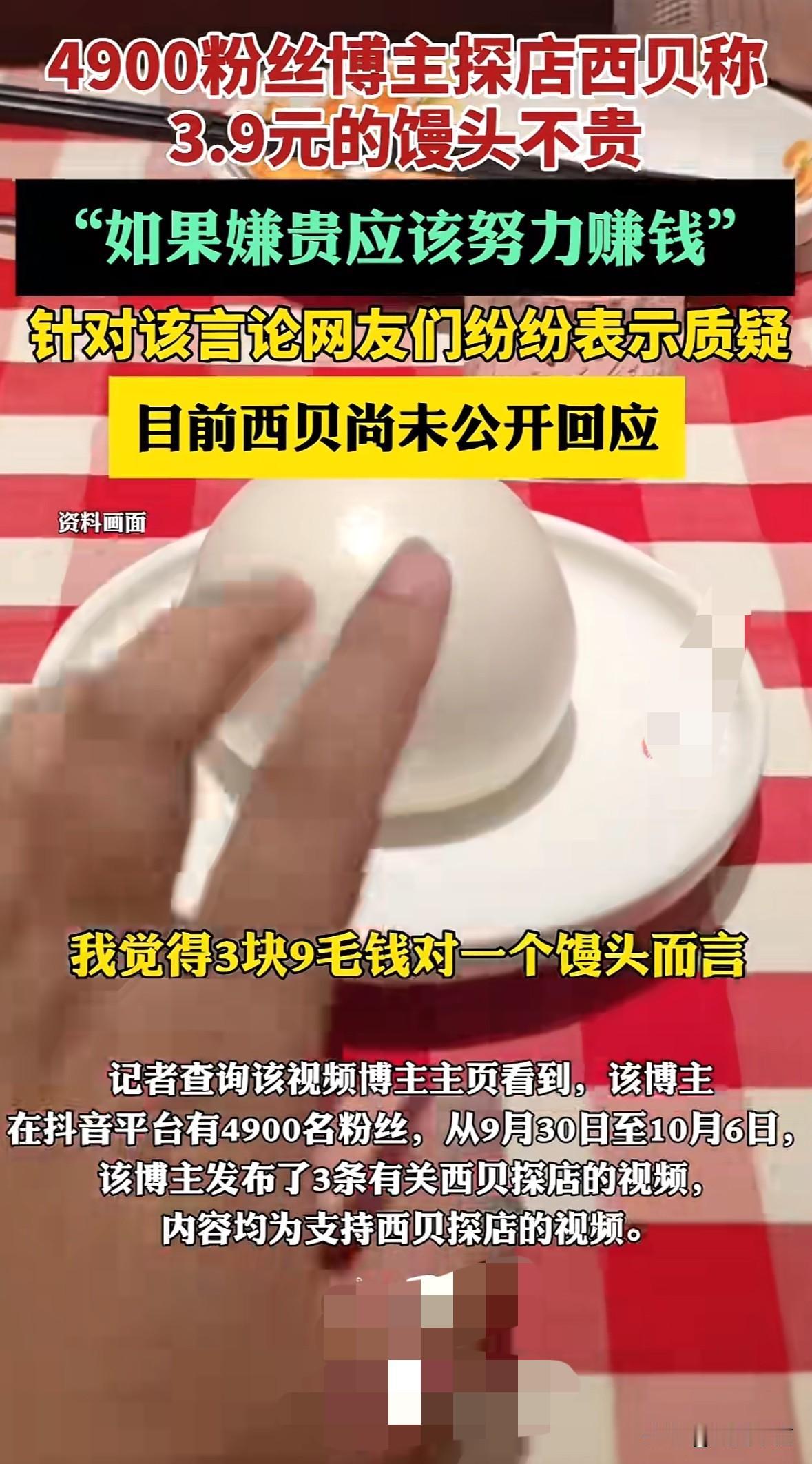 本来西贝的话题已经“降温”了,但是没想到被一个探店博主又给推到了风口浪尖,这个博主说3.9元的一个馒头不贵,这句话没什么,可是他又说“如果嫌贵应该努力挣钱” 这句话可把网友气得不轻,大家纷纷怒斥这个博主的言论,可能你认为3.9元的一个馒头无所谓,但对其他人来说可能就是有点贵 而且馒头这个很普通的东西,值不值这个价大家都有评论的权利,你一个才几千粉丝的博主口气也太大了 现在有人质疑这个博主发视频的动机,但毫无疑问又把西贝架在火上烤了!