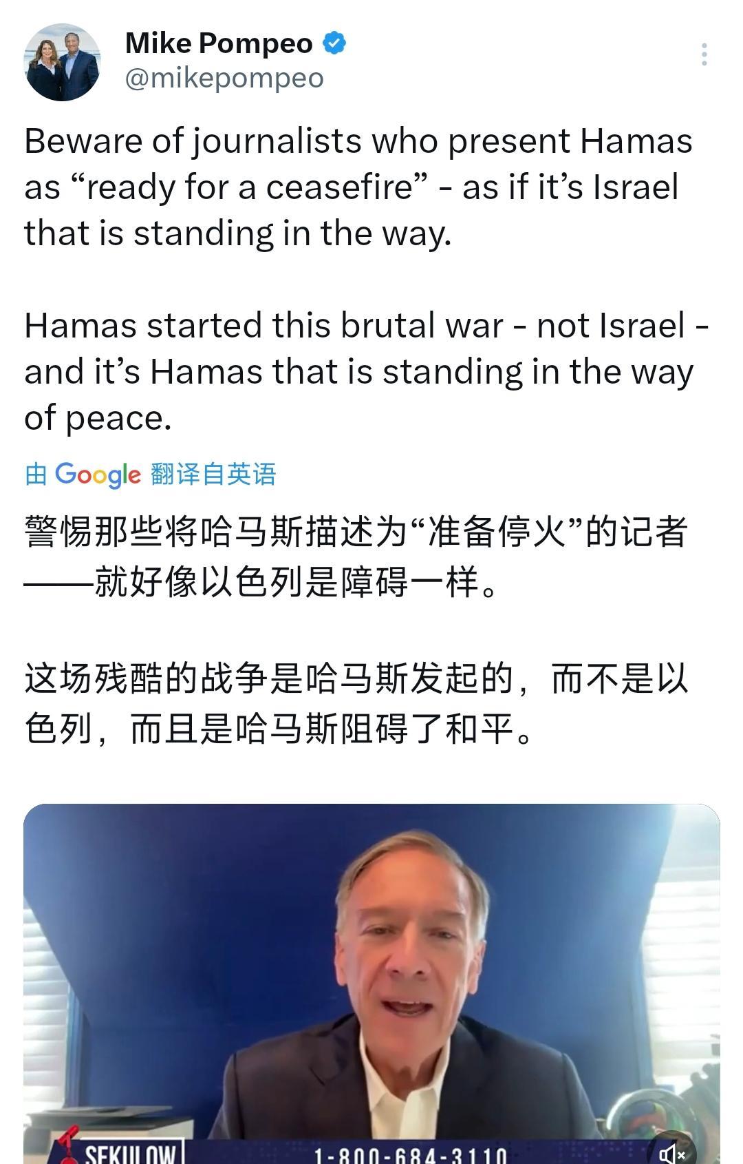 美国前国务卿蓬佩奥今天(北京时间10月8日)写道:“警惕那些将哈马斯描述为‘准备停火’的记者——就好像以色列是障碍一样。这场残酷的战争是哈马斯发起的,而不是以色列,而且是哈马斯阻碍了和平。” [机智]评几句:蓬佩奥之言简直是颠倒黑白!几十年来,以色列对巴勒斯坦人民犯下累累罪行,强占土地、拆毁家园、限制自由,巴勒斯坦人长期生活在水深火热之中。两年前的十月七日哈马斯实施了恐怖行动,挑起了战事,但那也是长期压迫下的反抗。此前以色列的种种恶行才是冲突根源,此后其军事行动更造成大量伤亡。蓬佩奥这般为以色列开脱,实乃无耻至极!