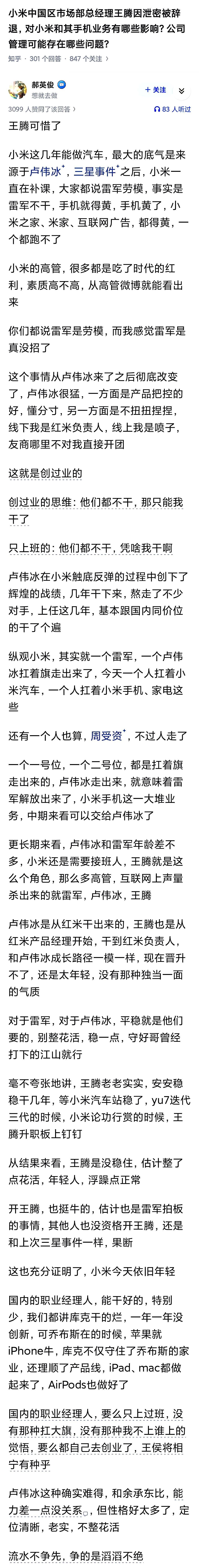 这哥们儿是个人才,升职快如火箭,坠落速度也快,短短这几年,把职业生涯周期走完一轮,跟活在了币圈一样~ 之前当接班人的周受资走了,现在王腾又叛变了,雷总又被伤了一次! 小米拿得出手大将就剩下卢伟冰,能力绝对比大嘴牛,小米能冲高端旗舰,现在能去做小米汽车,很大功劳是以为卢把红米品牌带起来填补原先小米的价位。 而王腾必有竞业协议的,而且因为这种过错,哪家公司敢要,只能自己做做自媒体或者自己投资了… 要知道,这种公开处刑基本代表职业生涯结束了,到了这个级别,不可能没有大雷就整得这么不体面。而违反职业道德被开除这种事,但凡是个正常公司都会退避三舍。