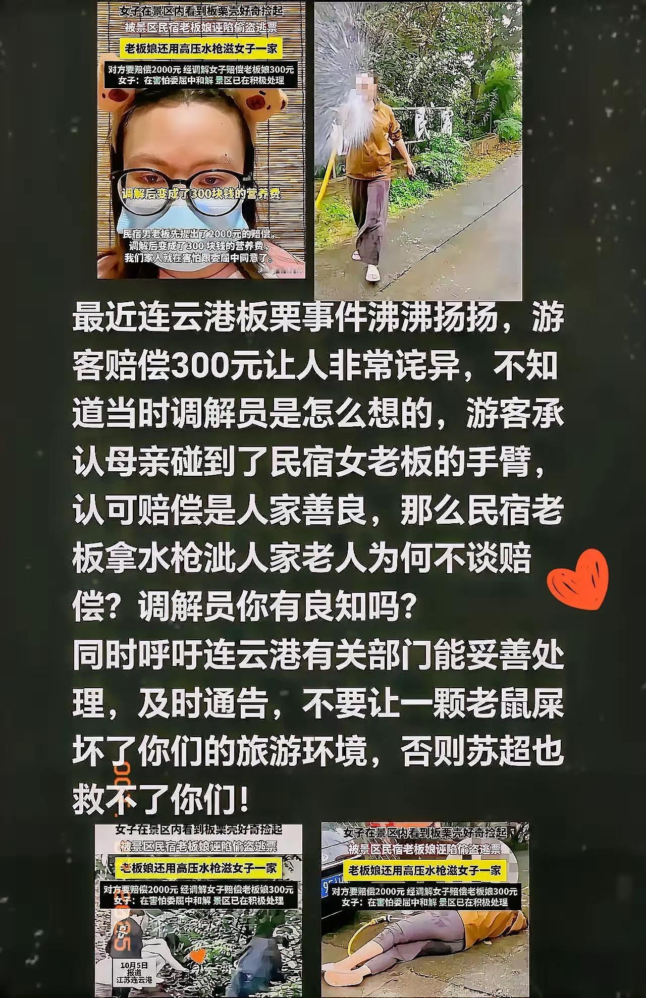 板栗事件 最近连云港板栗事件沸沸扬扬,游客赔偿300元让人非常诧异,不知道当时调解员是怎么想的,游客承认母亲碰到了民宿女老板的手臂,认可赔偿是人家善良,那么民宿老板拿水枪泚人家老人为何不谈赔偿?调解员你有良知吗? 这调解员怕不是拿着“和稀泥”的剧本上岗的吧?游客母亲碰人手臂,赔300元是善良,可民宿老板拿水枪泚老人,这已经不是“小摩擦”了,分明是欺负人!调解员只盯着游客的“过错”,却对民宿老板的恶劣行为装聋作哑,这不是“公平调解”,是“拉偏架”! 网友们表示 表面看民宿店得了300块的昧良心钱,实际上整个连云港的商家都一起陪着这家民宿店损失一大笔收入,我不明白为何连云港开民宿店的老板们为何还不去砸玻璃,还在等什么? 民宿老板是当地人,调解员是当地人,游客是外地人,就这么简单[呲牙] 当地人还能帮你外地人?我银龙二期租房到期了,一个三无电视挂墙上二年没开,现在开机屏幕不蓝,然后主家打110报警,叔叔的干儿子来现场说人家以前是好的呀,非要赔个电视给她,不赔叫去派出所调解,主家坐他们车子,我们骑电动车去,反正押金不退给你[捂脸] 作为连云港人都认为民宿老板太欺侮人了,游客只是出于好奇,拿一个看看,就成了小偷,竟然还赔了300元,不知道处理事情的人,是怎么想的,今后还会有人敢来这地方旅游吗? 调解的是本地人,说不定还是什么拐弯的亲戚和同村的,几乎天天见,游客走了就走了,所以基本就是游客有错帮弄点钱,游客没错就让商家口头道歉并教育以下不给发视频,各地宰客商家真的以为当地各部门不知道吗? 大家怎么看呢