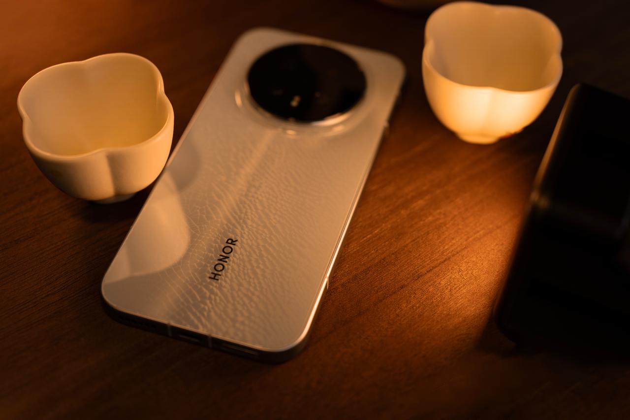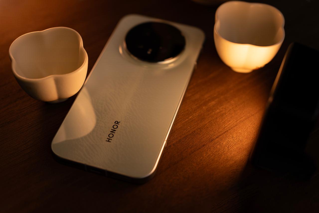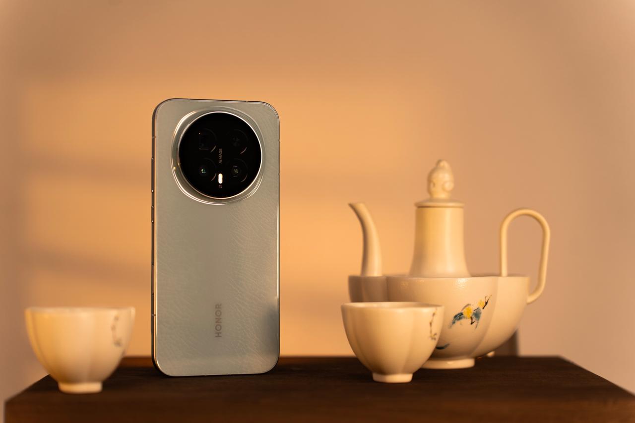 我们给荣耀Magic8标准版拍了一组图,配色名为天青釉,灵感来自宋代汝窑,表面仔
