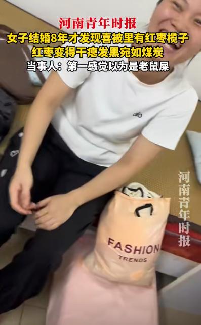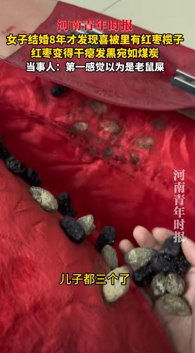 万万没想到!广东,女子打扫卫生,在柜子里发现8年前结婚铺床用的喜被,她心想里面肯定有红包,打开一看她傻眼了!红枣已经干瘪发黑宛如煤炭,榄子也已经发霉。女子发视频吐槽,结婚8年的枣子还在这,儿子都三个了!网友:怪不得生那么多儿子。 转眼间王女士(化名)和丈夫已经结婚八年了,在这八年时间里面两人生活的很幸福,而且还生下了三个孩子。 然而就在前一段时间她与孩子们说起来当年结婚的时候,王女士突然想起来结婚的时候有一条红被子还从来都没盖过,随即她便翻箱倒柜的给找了出来。 谁料刚打开,映入眼帘的便是好几颗黑不溜秋的东西,这时候王女士还以为是这么多年没有动过老鼠在里面拉的。等她凑近去查看的时候却发现,这些并不是老鼠屎。 而是已经发霉的红枣,看到这之后王女哭笑不得就将这件事情发布到了到视频平台上面,不料瞬间引起了广大网友的纷纷留言。 一些网友在下面调侃说,王女士真的没有辜负这些红枣的象征“早生贵子”的含义,已经生了三个孩子了。 还有一些网友在下面评论说,他觉得结婚的时候弄的这个红被子简直就是浪费,因为只有在结婚当天的时候铺床用,随后就直接扔到柜子里面了。 那么这些被重新发现的婚嫁旧物,看起来只是家务时的小插曲,却能引起很多人的共鸣。有人看完新闻,也想去翻自己的嫁妆箱、陪嫁碗,想看看里面有没有被忘掉的“宝贝”。 其实,这种行为更像是一场温情的回忆。当人们看到这些东西的时候,结婚当天的回忆就会翻涌上来,记住当时的美好瞬间。 通过这件事情也告诉了我们,真真正正能够打动人心的并不是东西的贵重,而是东西背后蕴含的情感。 对此,你还有什么看法呢? (信息来源 :观象视频 2025-10-06)