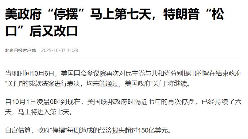 10月7日,美国白宫国家经济委员会主任,凯文·哈西特在CNN镜头前宣布:政府每停摆一周,GDP蒸发150亿美元,相当于每周从每个美国人钱包里抠走45美元。 从10月1日开始,这场停摆已经持续一周,大家生活里不少事儿都跟着卡壳了。而凯文·哈西特作为共和党大佬,又是特朗普政府的核心成员,他这话明摆着是给民主党施压——赶紧在预算问题上让步,别再耗着了。 其实这场停摆的根源,就是两党在钱的问题上谈不拢。民主党坚持要延长“奥巴马医改”里的保费税收抵免,这关系到2200万美国人的医保优惠,要是断了,不少低收入家庭看病就得多花钱;可共和党不乐意,他们想削减这笔开支,还非要在预算里加钱强化边境管控。 两边谁都不让步,9月30日深夜参议院连续否决了两党各自的提案,到了10月1日零点,联邦政府非核心部门直接“关门大吉”。 停摆一周的影响早就蔓延到各个角落。75万联邦雇员被迫无薪休假,还有130万军人拿不到薪水,不少人得去食品银行领免费食物,还有人晒出房贷催款短信说“再不开工房子就没了”。 机场更是乱成一锅粥:洛杉矶伯班克机场有6个小时没人管空管,丹佛、芝加哥这些大机场的航班大面积延误,候机楼里到处是抱怨声,有人本来要赶飞机出差,结果硬生生被困了一整天。 更夸张的是纳什维尔机场的空管中心,因为人手不够直接关了5小时,好几架飞机只能在天上绕圈等降落。 美国交通部长都承认,有些地区的空管人员比平时少了一半,物流、旅游业跟着倒霉——国家公园关门后,周边小镇的餐馆、旅馆每天少赚7700万美元,港口清关变慢,进出口企业的货物堆在码头,老板们急得直跺脚。 老百姓办事也处处碰壁,虽然社保金还能照常发,但12%的社保工作人员停工,想办社保卡、查询养老金的人只能排超长队。 农民们更是愁眉苦脸,原本10月7日要发布的农业援助计划,因为停摆直接搁置,大家等着补贴买种子化肥,现在只能干着急。 这边老百姓急得团团转,那边两党还在国会山上互相甩锅。特朗普一边骂民主党是“故意搞破坏”,一边偷偷让各部门准备裁员名单,像环保局、教育部这些他一直看不顺眼的部门,估计要先“开刀”。 民主党也不甘示弱,反过来要求调查特朗普政府是不是在夸大停摆损失。参议院一周内开了5次会都没谈出结果,众议院干脆休会到14日,把烂摊子扔在那儿不管了。 哈西特说的“每周蒸发150亿GDP”,其实就是共和党打的心理战——他们知道老百姓最在乎钱包,想用数字逼民主党服软。可民主党也有自己的算盘,医保补贴是他们拉拢蓝领选民的关键,一旦让步,中期选举就得丢票。 这场停摆说白了就是两党在争权夺利,可最后遭罪的还是普通美国人。