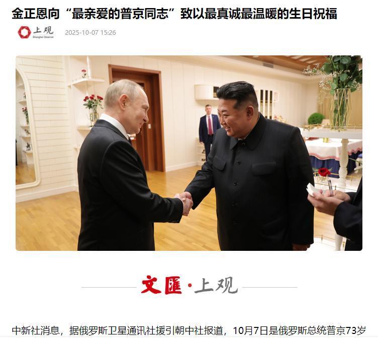 普京73岁生日当天,只有金正恩的贺电,还在用“同志”称呼普京! 10月7日,正是俄罗斯总统普京73岁的生日,整个国际社会的目光都盯着克里姆林宫,大家都想看看有哪些国际重要人物会送上祝福。 结果出来后挺出人意料的,众多国家里,只有朝鲜最高领导人金正恩的贺电成了最大焦点。 更让人关注的是,这封贺电一开头就用了“我最亲密的同志”来称呼普京,这简单的几个字,一下子就把人拉回了上世纪那种有着特殊情谊的年代,在现在的外交场合里,这样的称呼可不多见。 上世纪,社会主义国家之间互相交往时经常用这个词,代表着双方有着共同的理念,彼此信任又亲近。现在国际形势这么复杂,这种称呼已经很少听到了,所以这次金正恩这么叫普京,明眼人都能看出来,俄朝两国之间的友谊不一般,有着深厚的传统根基和特殊的政治联系。 而根据公开的消息,这些年俄朝在好多方面都合作得很紧密,不光是政治上相互信任,经济上也有不少往来,就连在国际上遇到事情,双方也会互相支持,一直都是实实在在、坦诚相待的态度。 至于其他国家的领导人没公开送祝福,这也不是偶然的。现在国际上的情况本来就错综复杂,有些西方国家和俄罗斯在不少问题上看法不一样,存在分歧,所以这些国家在外交表态上就显得比较谨慎,不想轻易表态。 但这并不代表俄罗斯在国际上就没人支持了,相反,朝鲜这次主动发贺电,还用上“同志”这样亲切的称呼,正好说明在当下这种特殊的国际环境里,靠着共同利益和历史交情建立起来的国家关系是很稳定的,不会随便受外界影响。 朝鲜这次主动发声,就是想告诉外界,俄朝之间的友谊不是表面功夫,而是经得起考验的。 而从历史角度来看,俄朝两国友好交往的时间很长了,在不同的历史阶段,这种关系都扛住了各种考验。 到了现在这个新时期,面对国际上共同的挑战,比如一些地区的不稳定因素、全球经济发展的压力等,双方更是进一步加强了合作,在维护地区和平稳定这件事上发挥了不少积极作用。 金正恩这次发贺电,不只是单纯给普京个人送生日祝福,更重要的是对俄朝两国关系的肯定,也表达了对未来继续深化合作的期待。 在当前这样复杂多变的国际形势下,俄朝之间这种特殊的外交互动其实传递了一个很明确的信号:国家之间只要互相尊重、有着共同利益,这份友谊就能保持韧性,在各种复杂情况面前站稳脚跟,成为国际舞台上一股不可忽视的稳定力量。