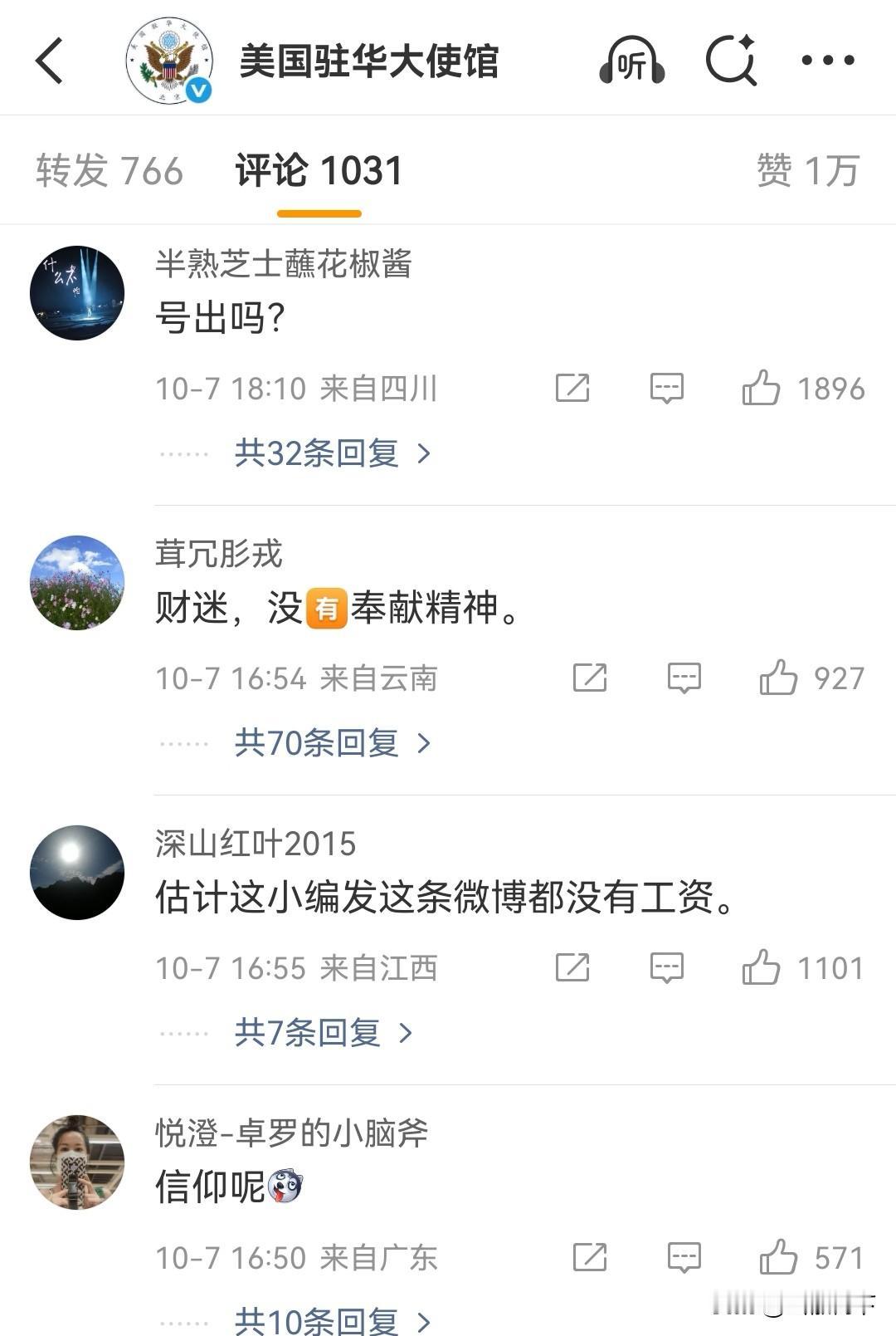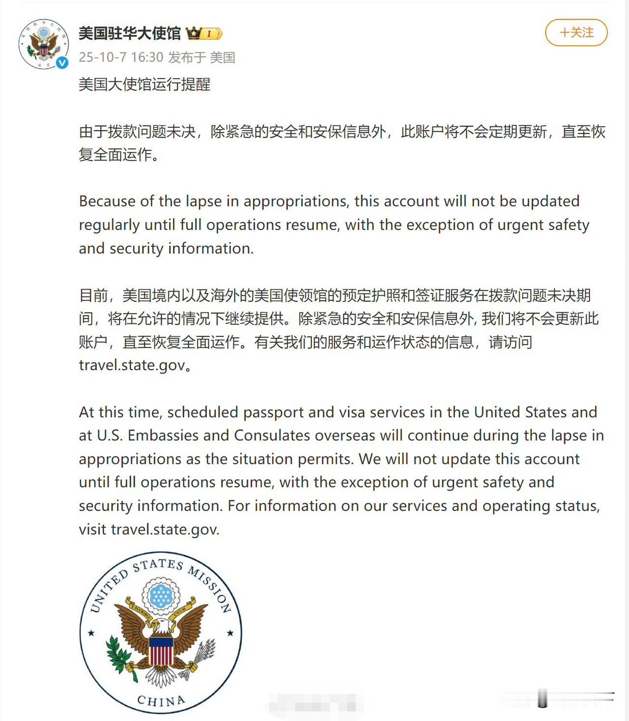 传下去,世界第一强国欠钱不给专坑自己人!10月7日,美国驻华大使馆官方微信和微博