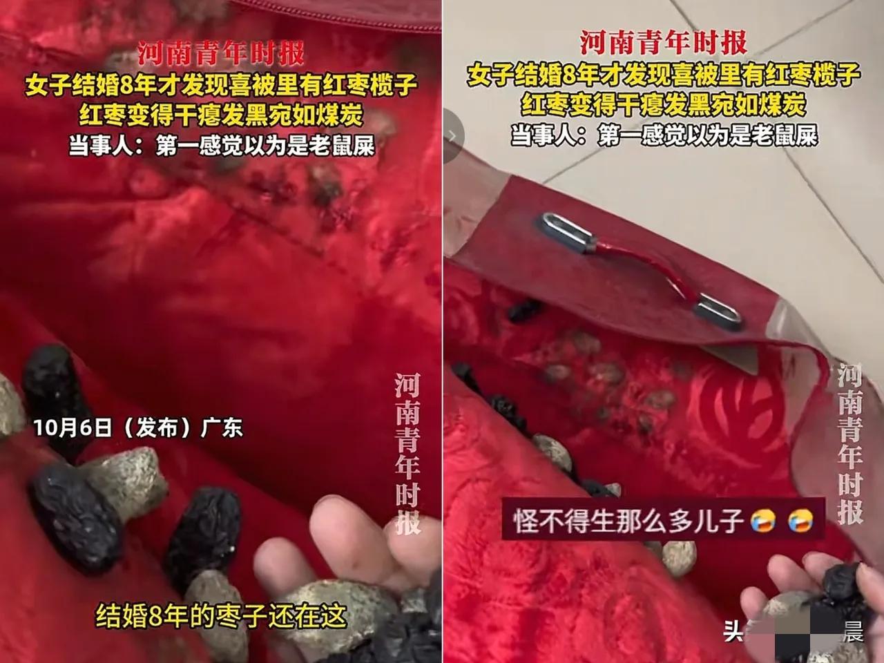 没想到! 广东一女子收拾柜子,翻出8年前的结婚喜被,本以为能摸出个红包,结果差点被吓一跳! 红箱子落满灰,拉开拉链翻开被子,十几个黑黢黢的东西粘在上面,她第一反应还以为是老鼠屎,仔细一瞅才发现是干瘪发黑的红枣和发霉的榄子。身边朋友笑得直不起腰,她自己也忍不住笑,调侃说儿子都三岁了,才知道喜被里藏着这宝贝。 这哪是变质的干果啊,分明是老一辈藏在被子里的“时光祝福”。很多地方结婚都有这习俗,把红枣、花生这些缝进被里,盼着新人“早生贵子”。现在年轻人结婚只顾着拍流程发圈,转头就把喜被收起来,根本没留意这些细节 。 东西虽坏了,但那份心意藏了8年没变。你结婚时的喜被里,也藏过老一辈的小心思吗?评论区聊聊~ 婚房婚喜被子 结婚喜被习俗