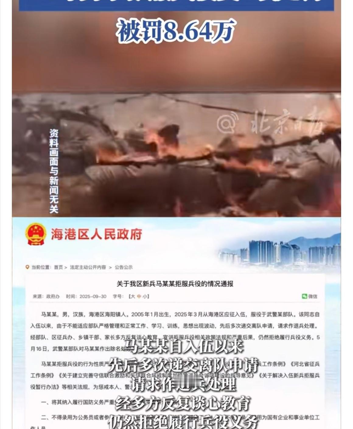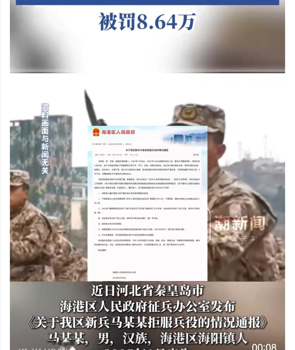 河北秦皇岛05年出生的马某拒绝服兵役,被处以七项处罚,罚款8.64万 从法律、社会责任和制度层面来看,这样的处罚具有明确的合理性,本质上是对“兵役义务严肃性”的有力维护。 首先,兵役是国家法律规定的公民义务,《兵役法》明确拒服兵役属于违法行为,处罚有坚实的法律依据。马某某入伍后因受不了管理多次申请离队,经教育仍拒绝履行兵役,已构成“拒服兵役”,并非不可抗力导致的无法服役,主观逃避的性质明显,处罚是对法律权威的维护。 其次,军队是特殊集体,纪律是战斗力的保证。若允许个人因“受不了严格管理”随意退出,会动摇军队管理的根基——试想,若人人可因个人不适就放弃兵役,军队的组织性、纪律性将无从谈起,最终损害的是国家的国防安全,而国防安全关乎每个公民的根本利益。处罚向社会传递了“兵役不是可随意放弃的选择”的信号,强化了“义务必须履行”的认知。 再者,7项处罚各有针对性:纳入失信名单是让失信成本与社会信用挂钩,限制考公、进国企等是剥夺因逃避义务而获利的机会,户籍注明字样是永久的信用记录,罚款则是对公共资源浪费的合理追偿(军队为其训练、管理投入了成本)。这些处罚并非“过重”,而是通过多元手段形成震慑,让潜在逃避兵役者意识到后果的严重性。 说到底,兵役义务的特殊性在于,它不仅是个人与国家的约定,更关系到集体安全。对拒服兵役者的处罚,既是对个体违法行为的纠正,更是对“公民需共同承担国防责任”这一社会共识的捍卫,具有鲜明的警示意义。