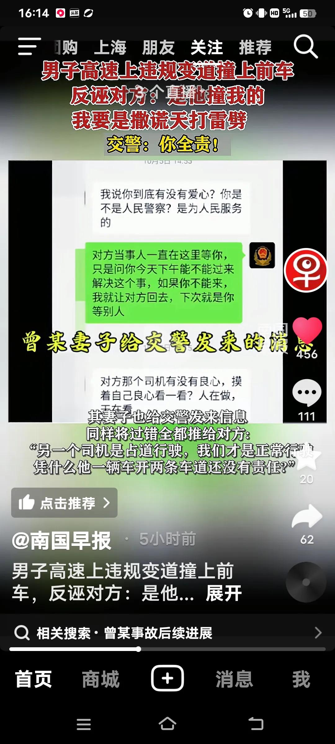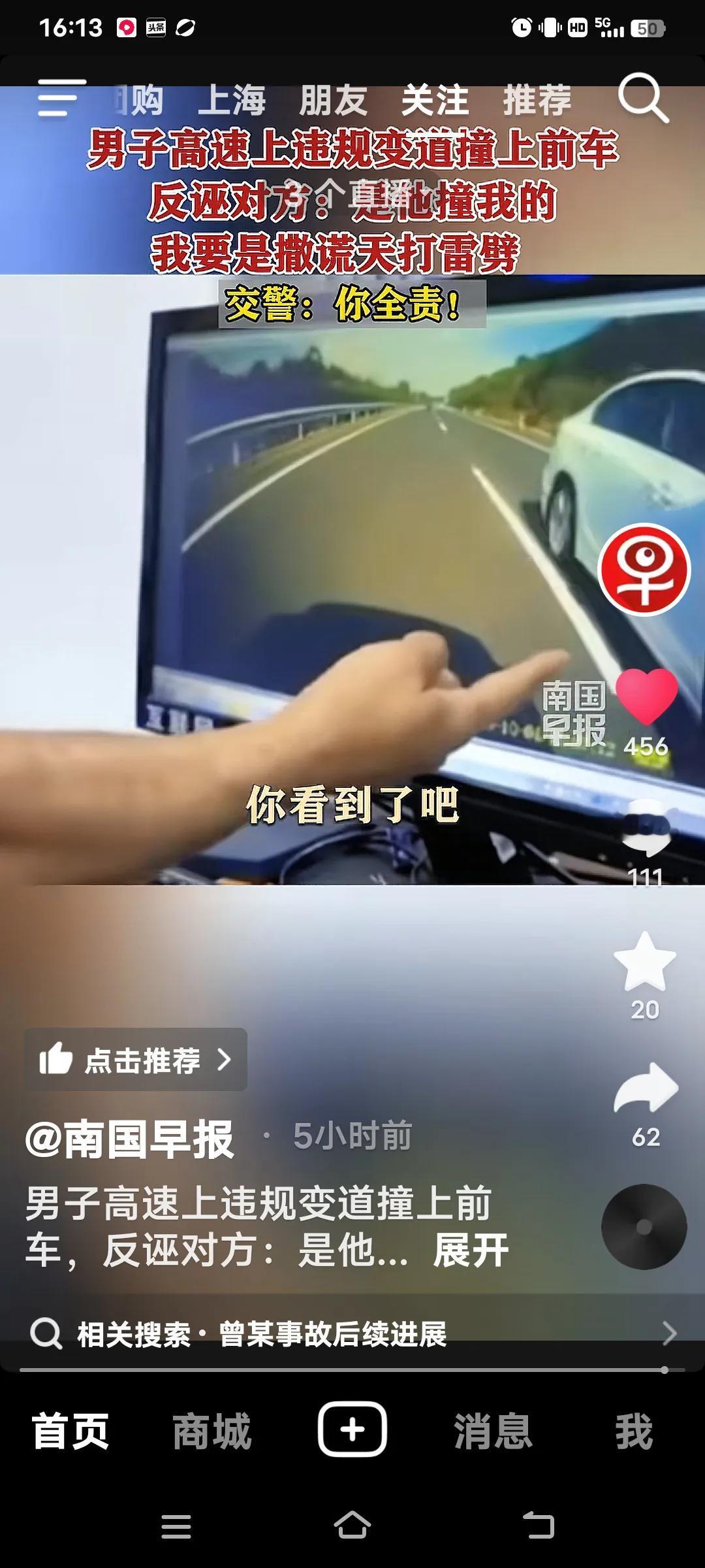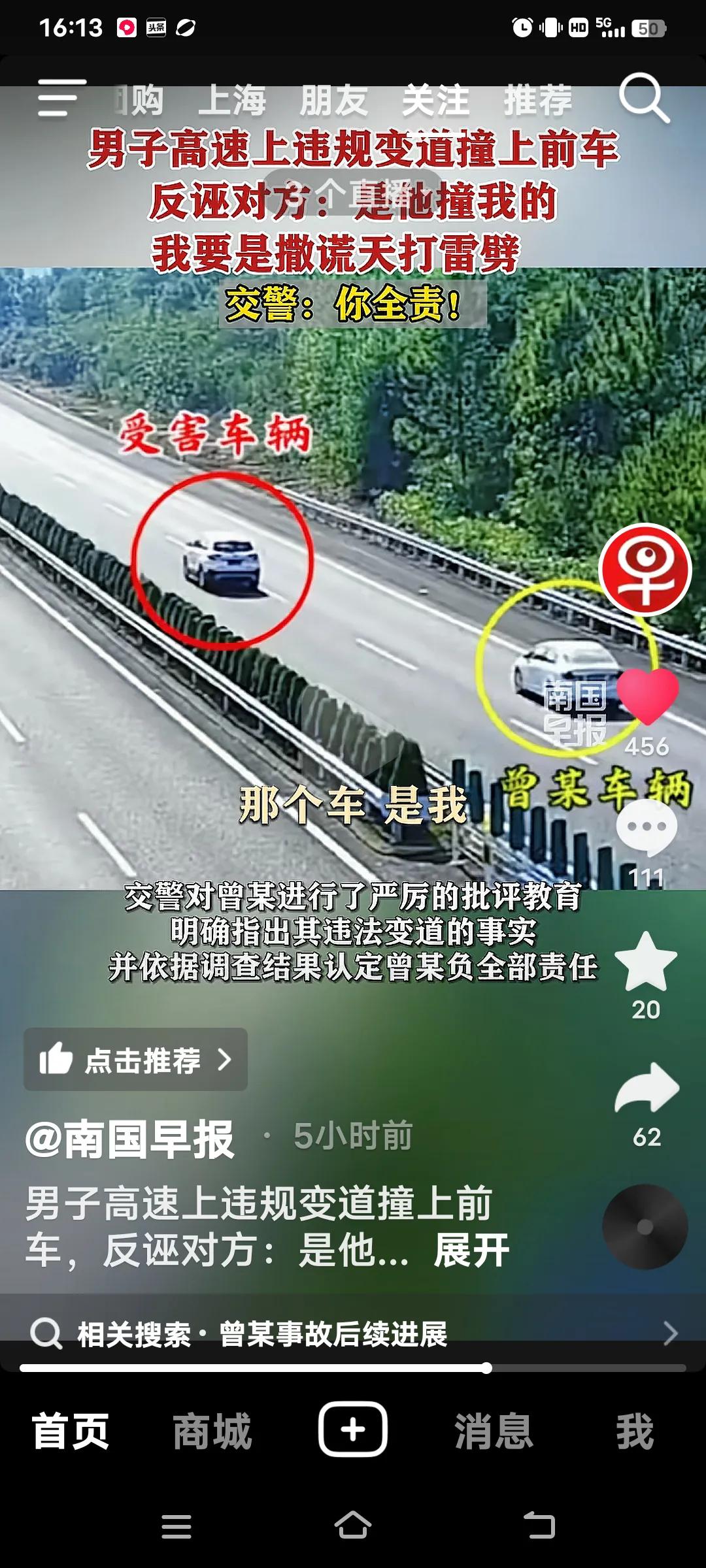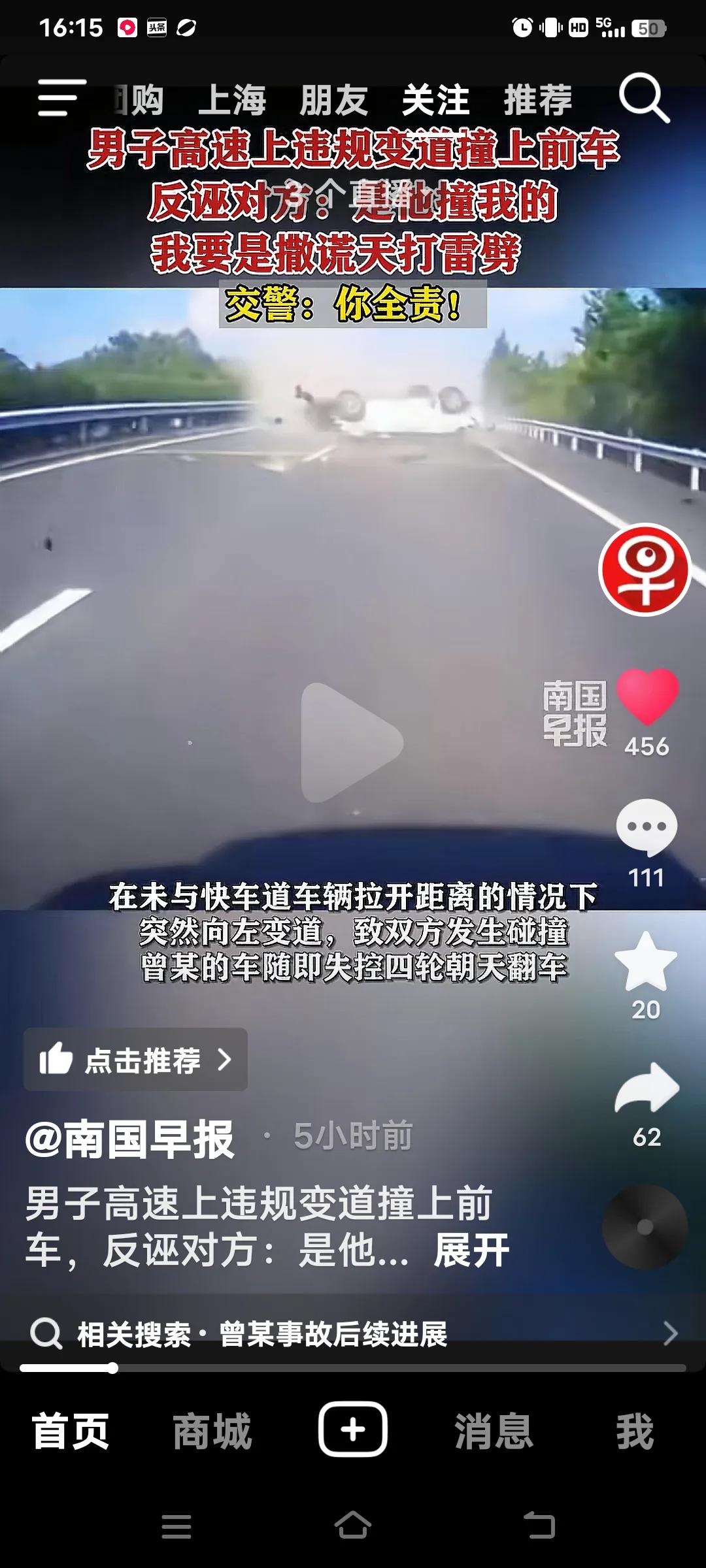 高速上违规变道撞上前车,交警:你全责! 10月4日,江西抚吉高速永丰段,曾某驾车车里有(妻子,弟弟和侄女),在慢车道行驶时,突然向左变道,致双方发生碰撞,曾某车四轮朝天翻车。事故双方受损,曾某的妻子和弟弟骨折,侄女皮外伤,幸好没有生命危险。 交警到场,面对交警的监控记录仪,曾某不仅认为自己无错还嘴硬的说,前面的车左右摇摆不知道可是睡着了?交警让他说话负责,他说“负百分之百的责,”手举高高的,如果说假天打雷劈。曾某的妻子也给交警发信息,同样也是把责任推给对方。反而还说做人是不是要凭良心?她的人伤的过重了! 好在遇到一个好的交警,就是你曾某的全责,又对他批评教育。再说了你撞向前面的车。人已经够倒霉的了,不能因为你们伤的重,就推卸责任,都是有监控的。不能随便反诬对方吧,必须为这样的好交警点赞!全责交通事故 追尾赔偿 高速路追尾 高速变道事故
