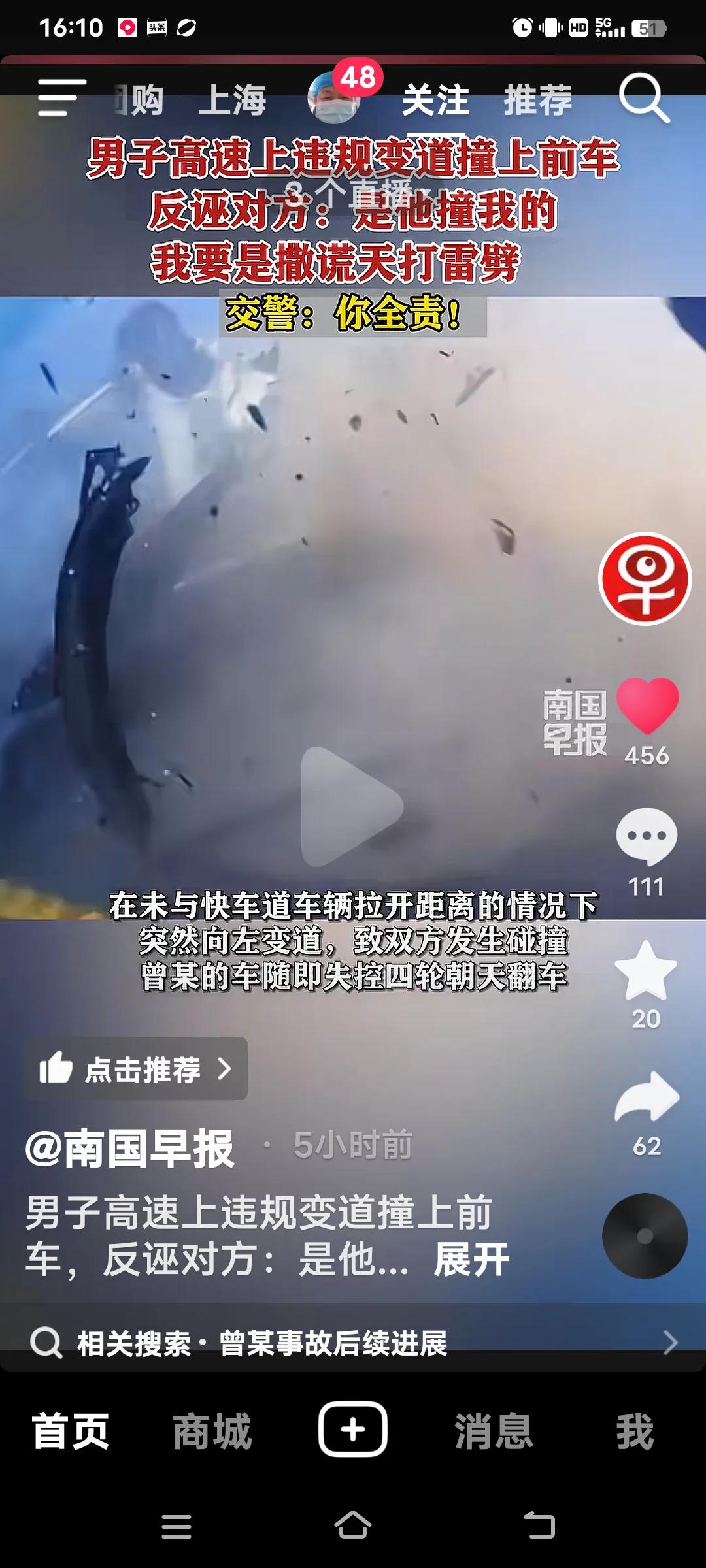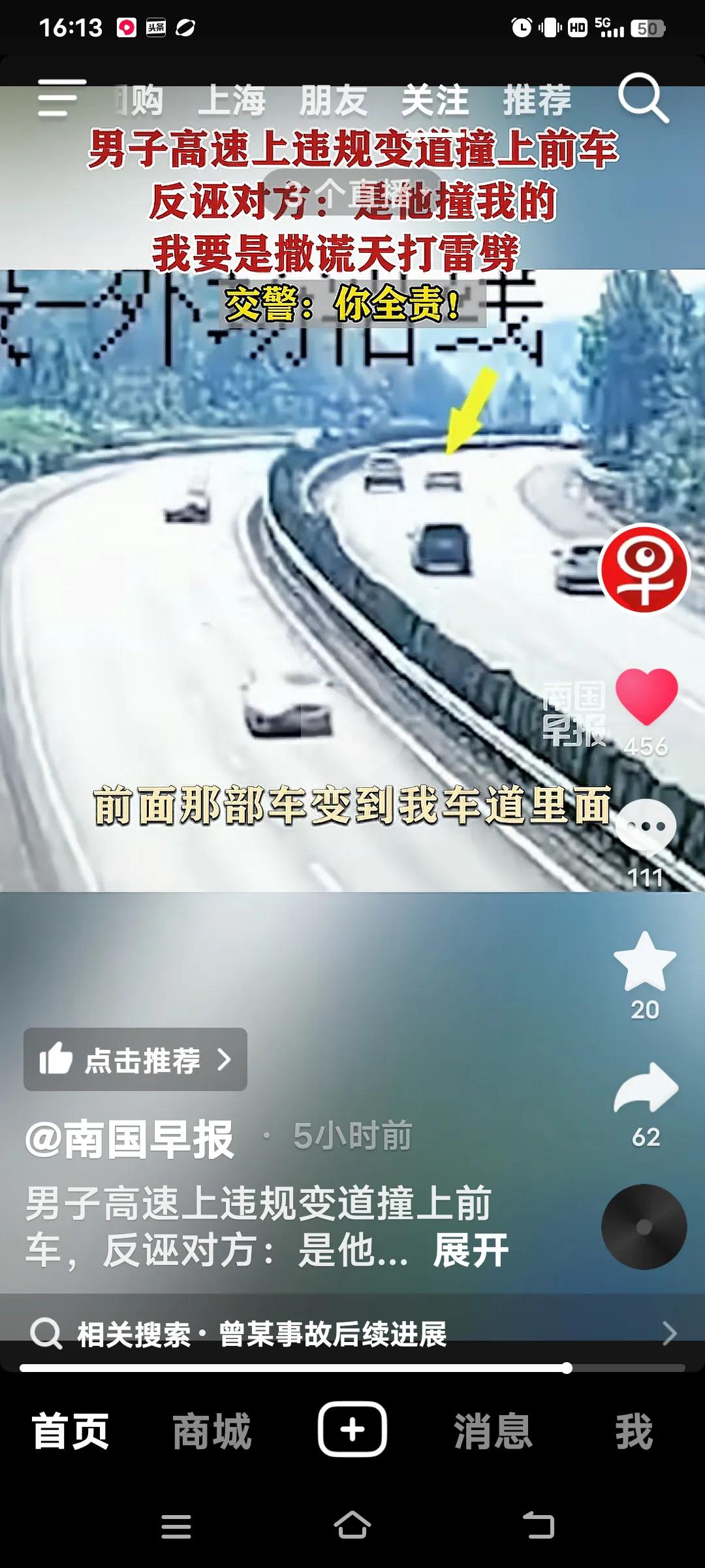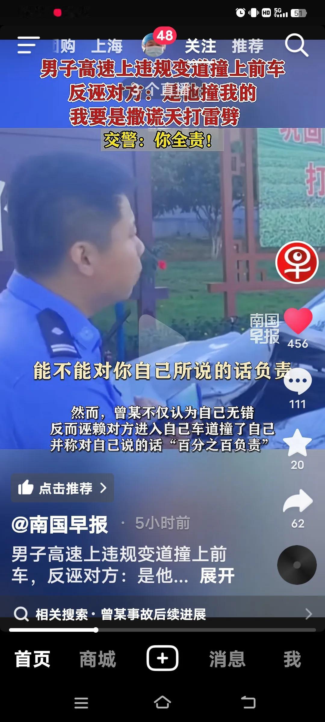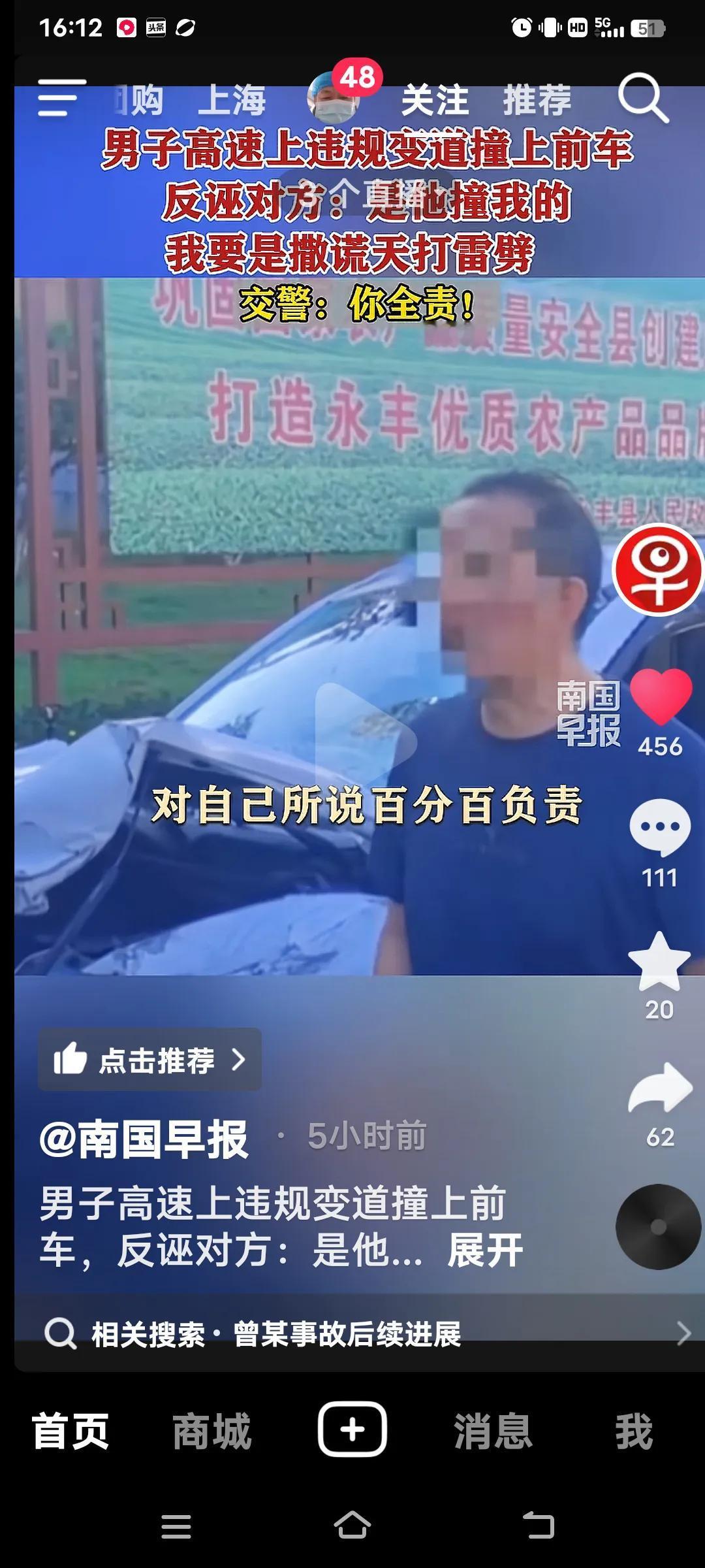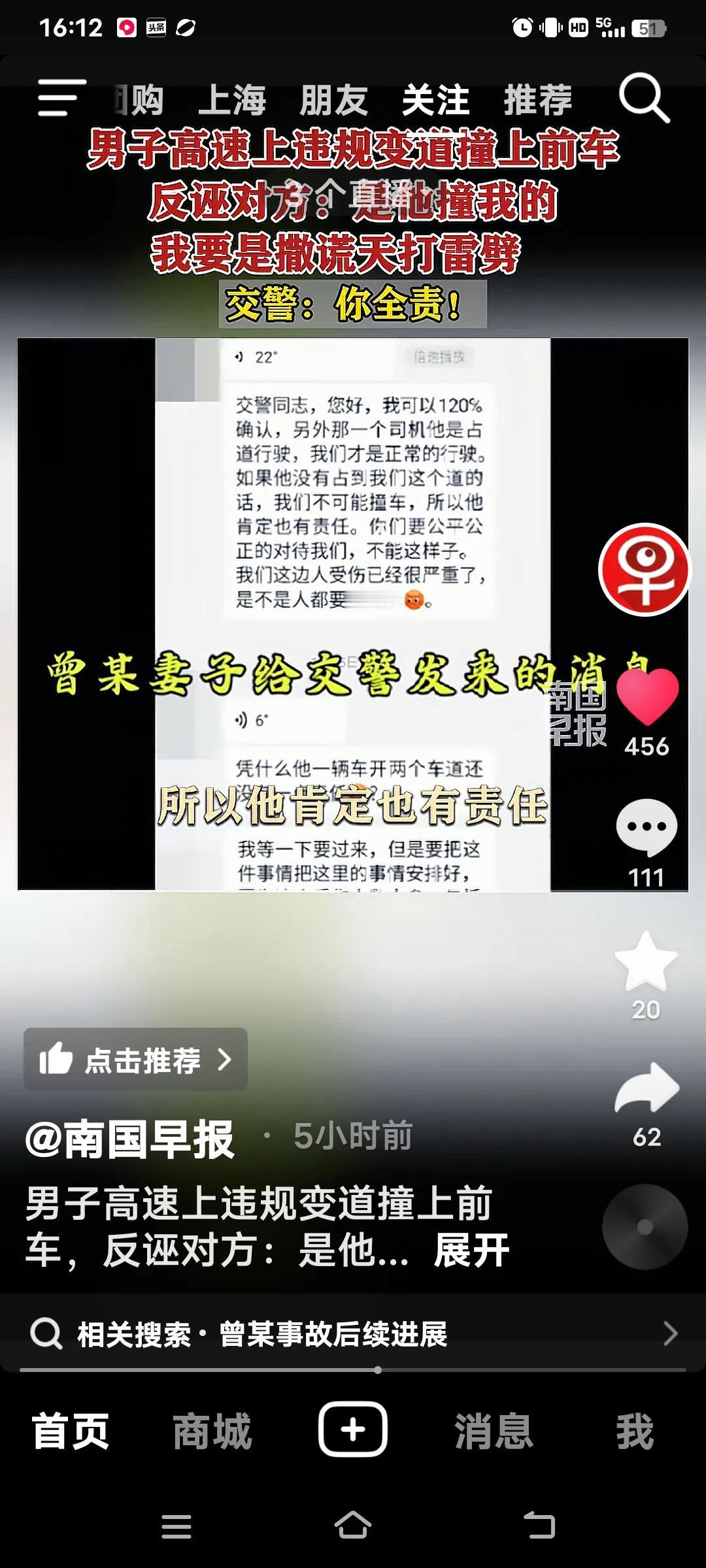 高速上违规变道撞上前车,交警:你全责! 10月4日,江西抚吉高速永丰段,曾某驾车车里有(妻子,弟弟和侄女),在慢车道行驶时,突然向左变道,致双方发生碰撞,曾某车四轮朝天翻车。事故双方受损,曾某的妻子和弟弟骨折,侄女皮外伤,幸好没有生命危险。 交警到场,面对交警的监控记录仪,曾某不仅认为自己无错还嘴硬的说,前面的车左右摇摆不知道可是睡着了?交警让他说话负责,他说“负百分之百的责,”手举高高的,如果说假天打雷劈。曾某的妻子也给交警发信息,同样也是把责任推给对方。反而还说做人是不是要凭良心?她的人伤的过重了! 好在遇到一个好的交警,就是你曾某的全责,又对他批评教育。再说了你撞向前面的车。人已经够倒霉的了,不能因为你们伤的重,就推卸责任,都是有监控的。不能随便反诬对方吧,必须为这样的好交警点赞!全责交通事故 追尾赔偿 高速路追尾 高速变道事故